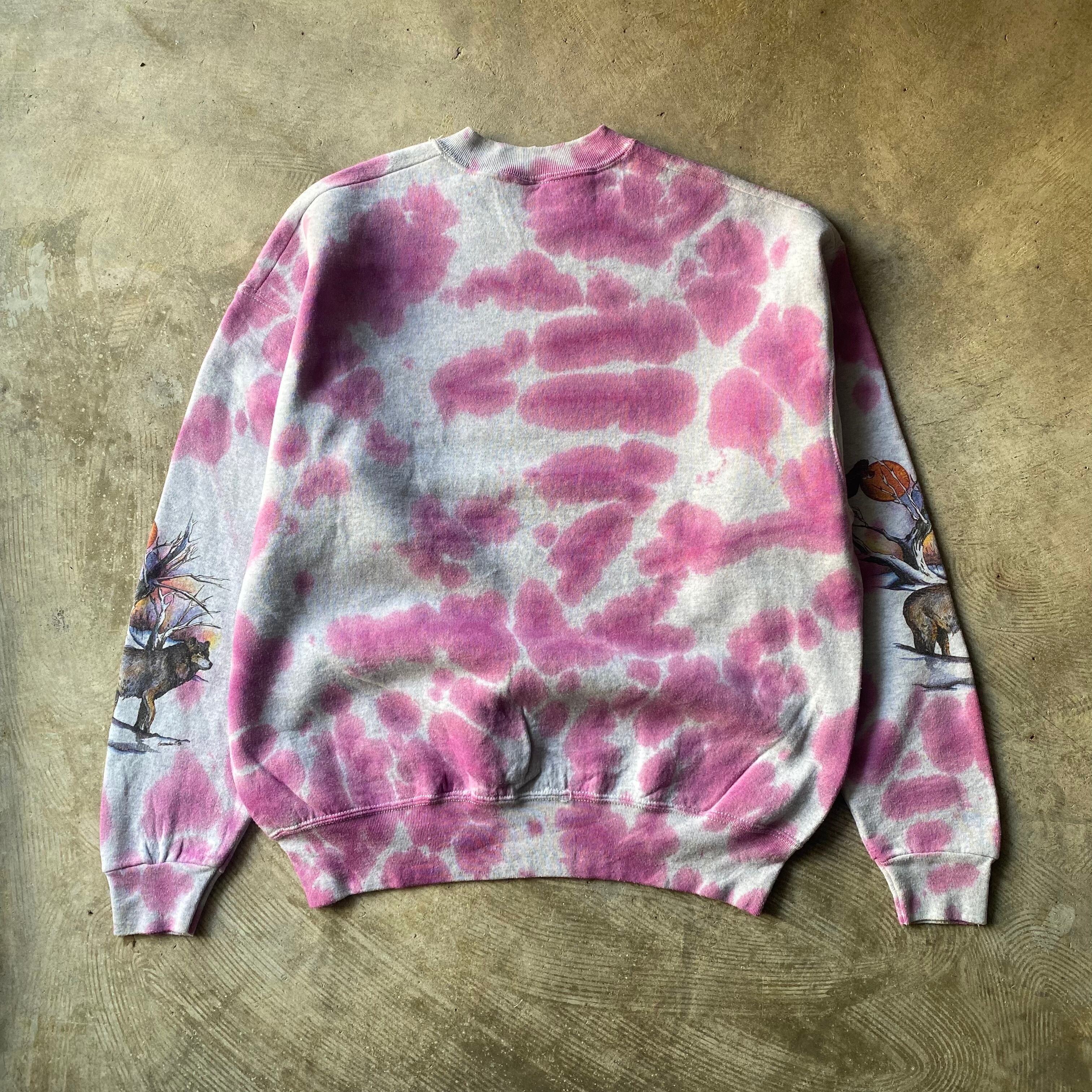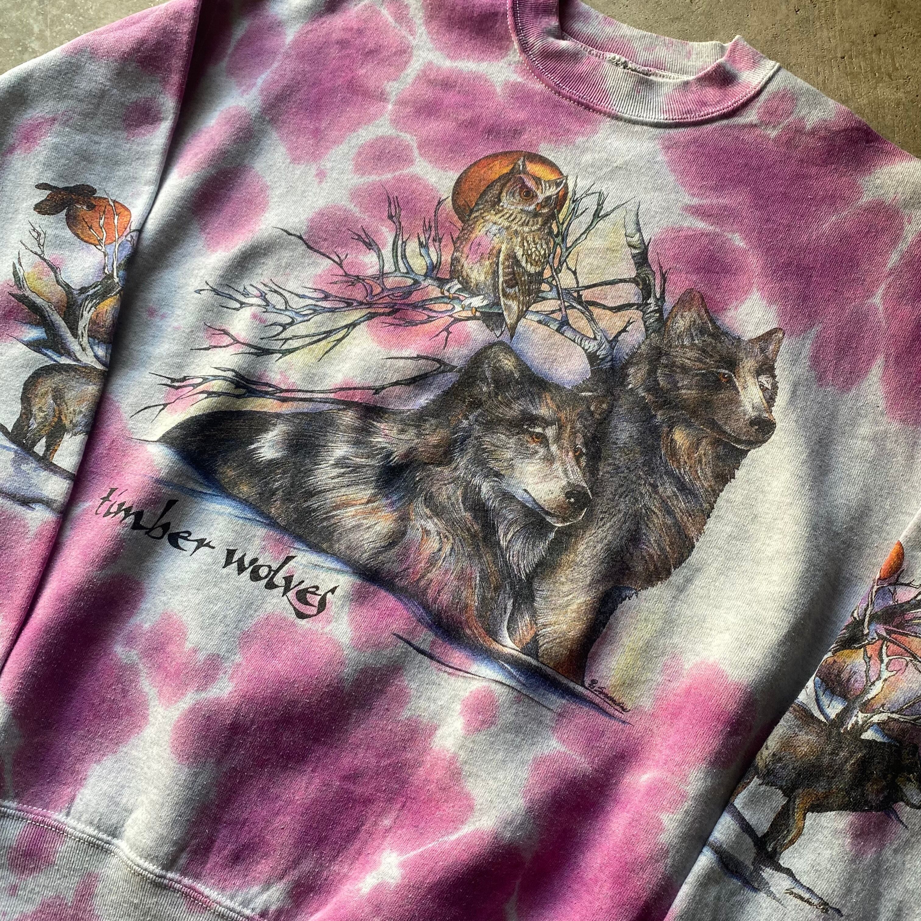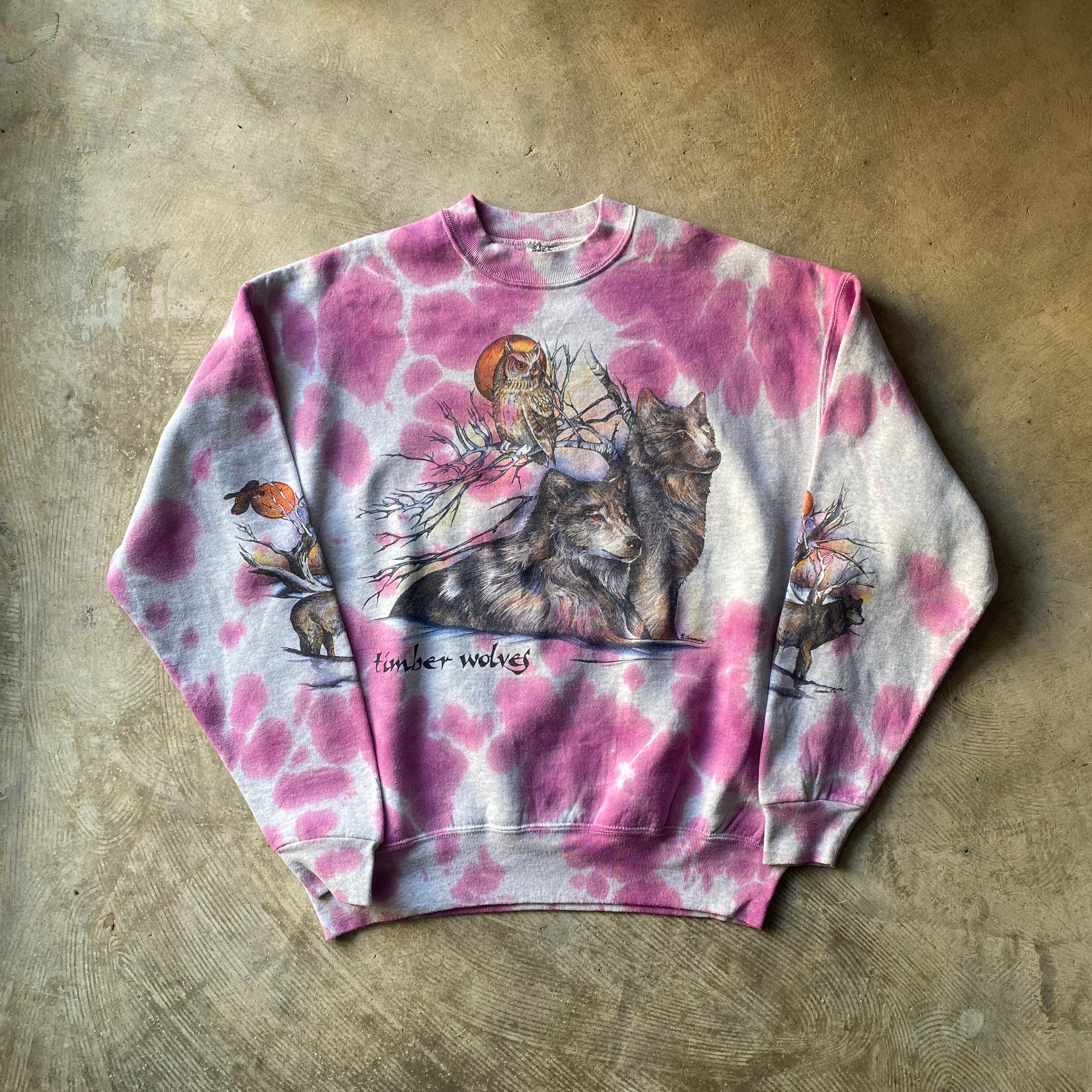フルーツボディのヘヴィスウェットをベースに絶妙なカラーバランスのタイダイとティンバーウルフのプリント。スリーブにも入るのは珍しいです◎
