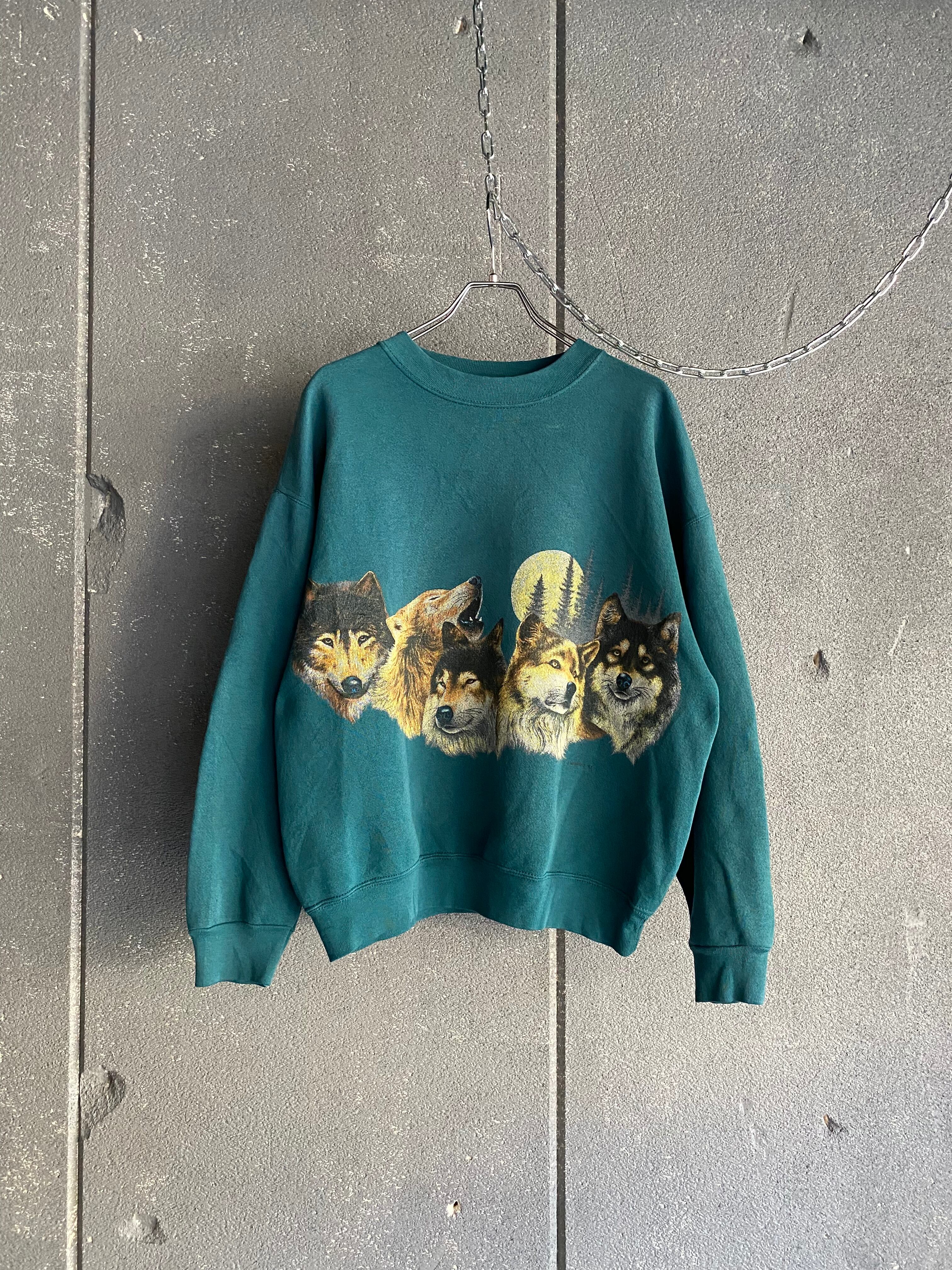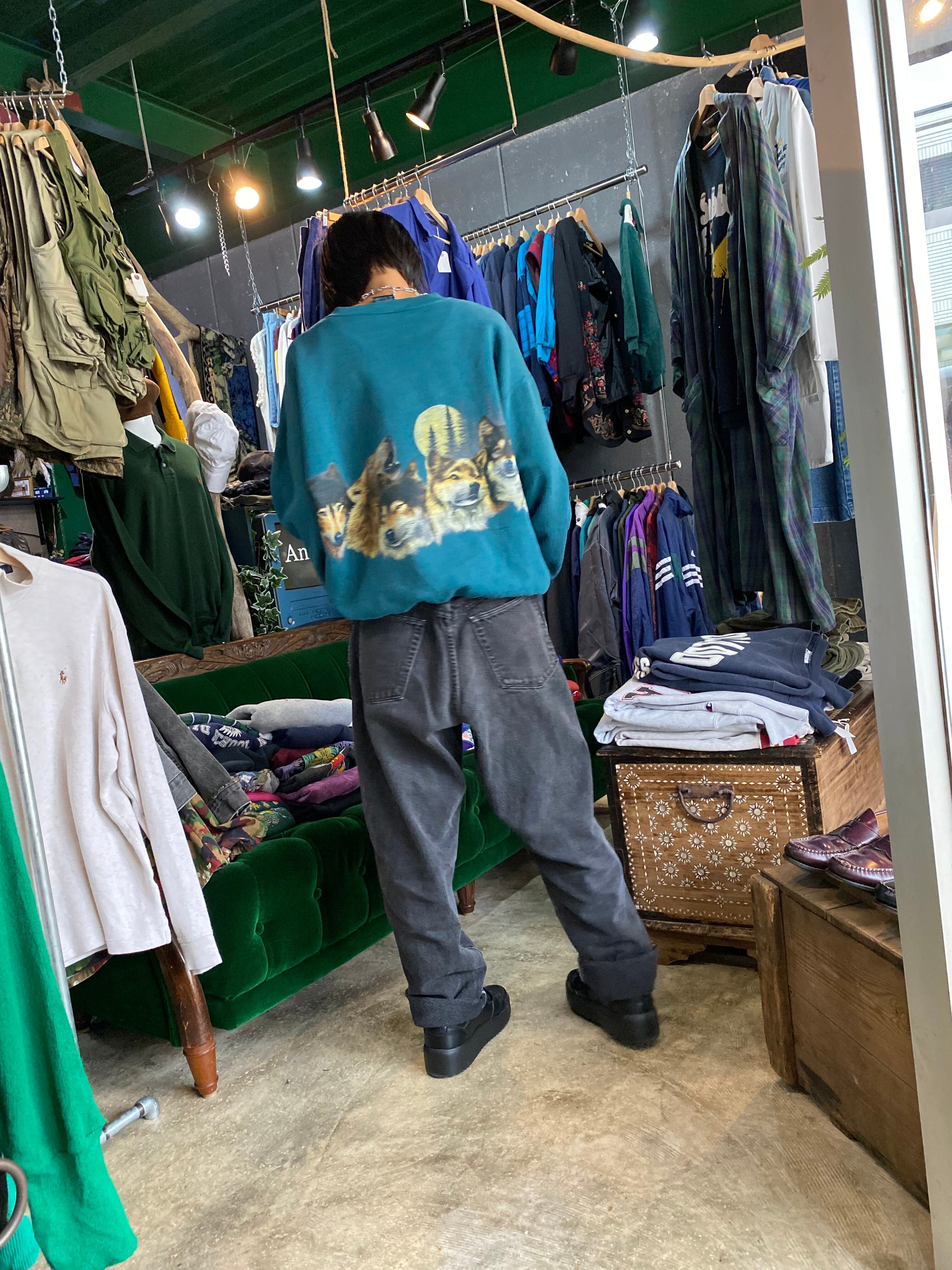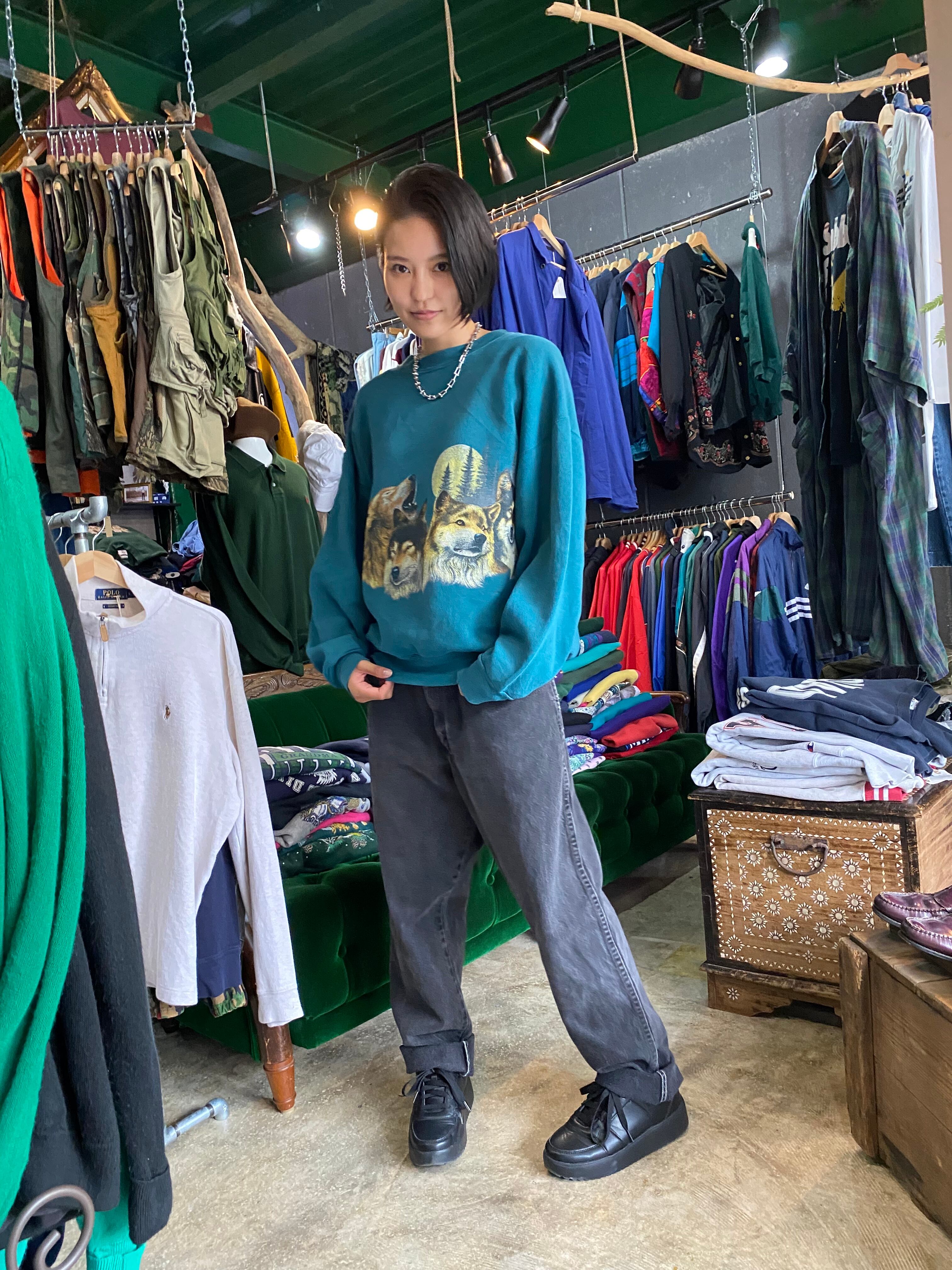 92年コピーライトの付くアニマルプリントスウェット。前にも後にもウルフがプリントされています。カラーリングもサイズも良い感じです◎