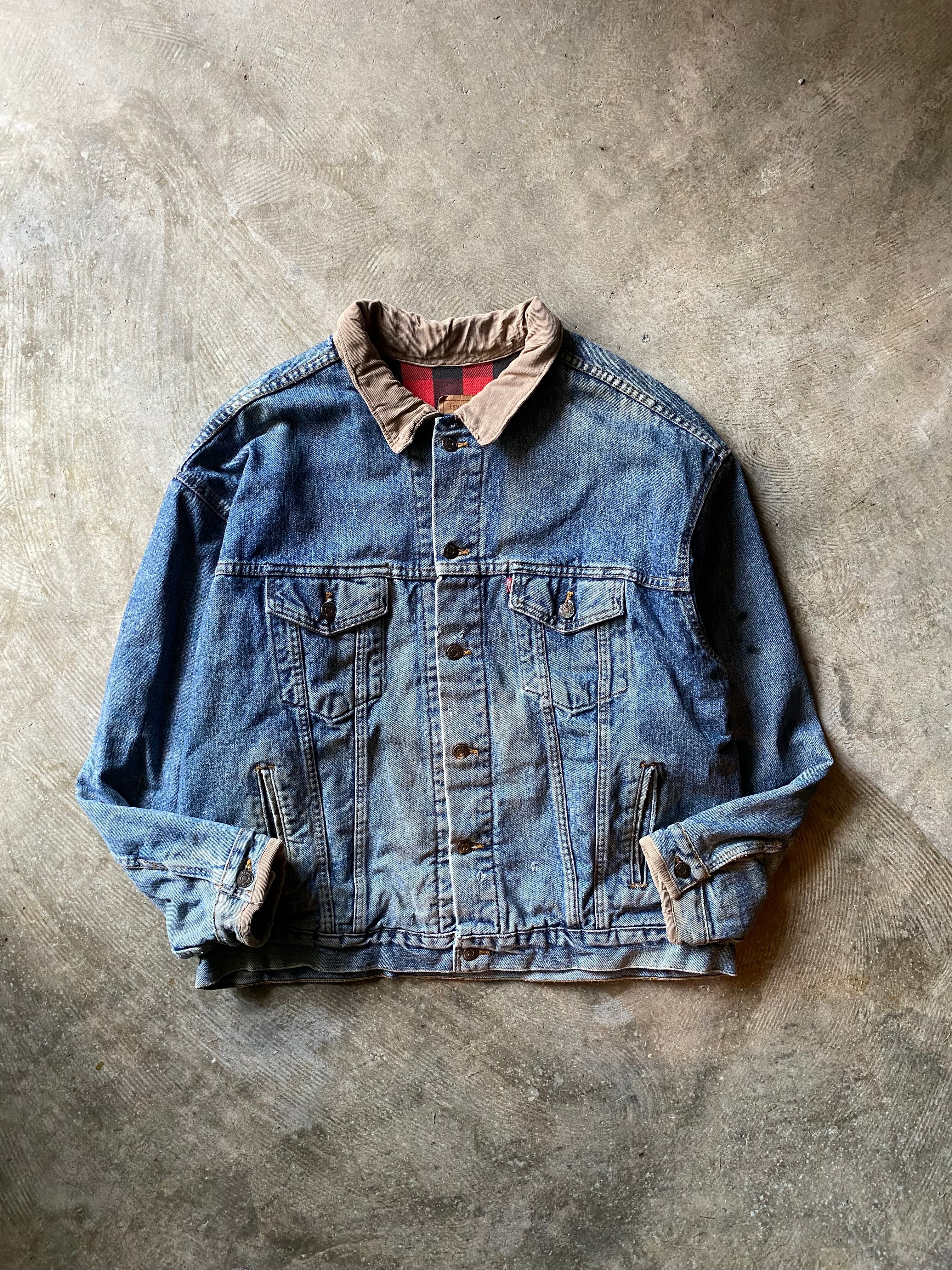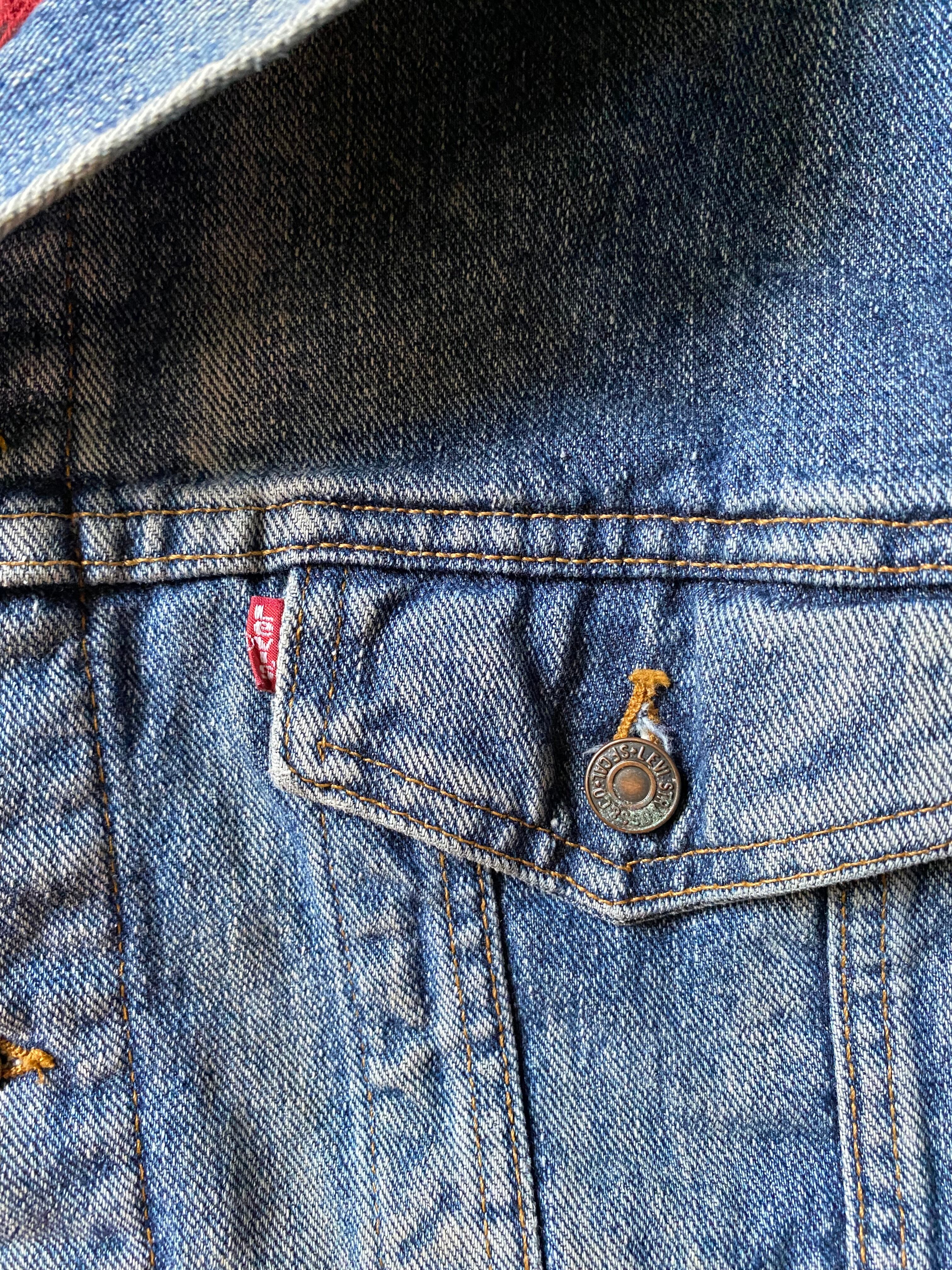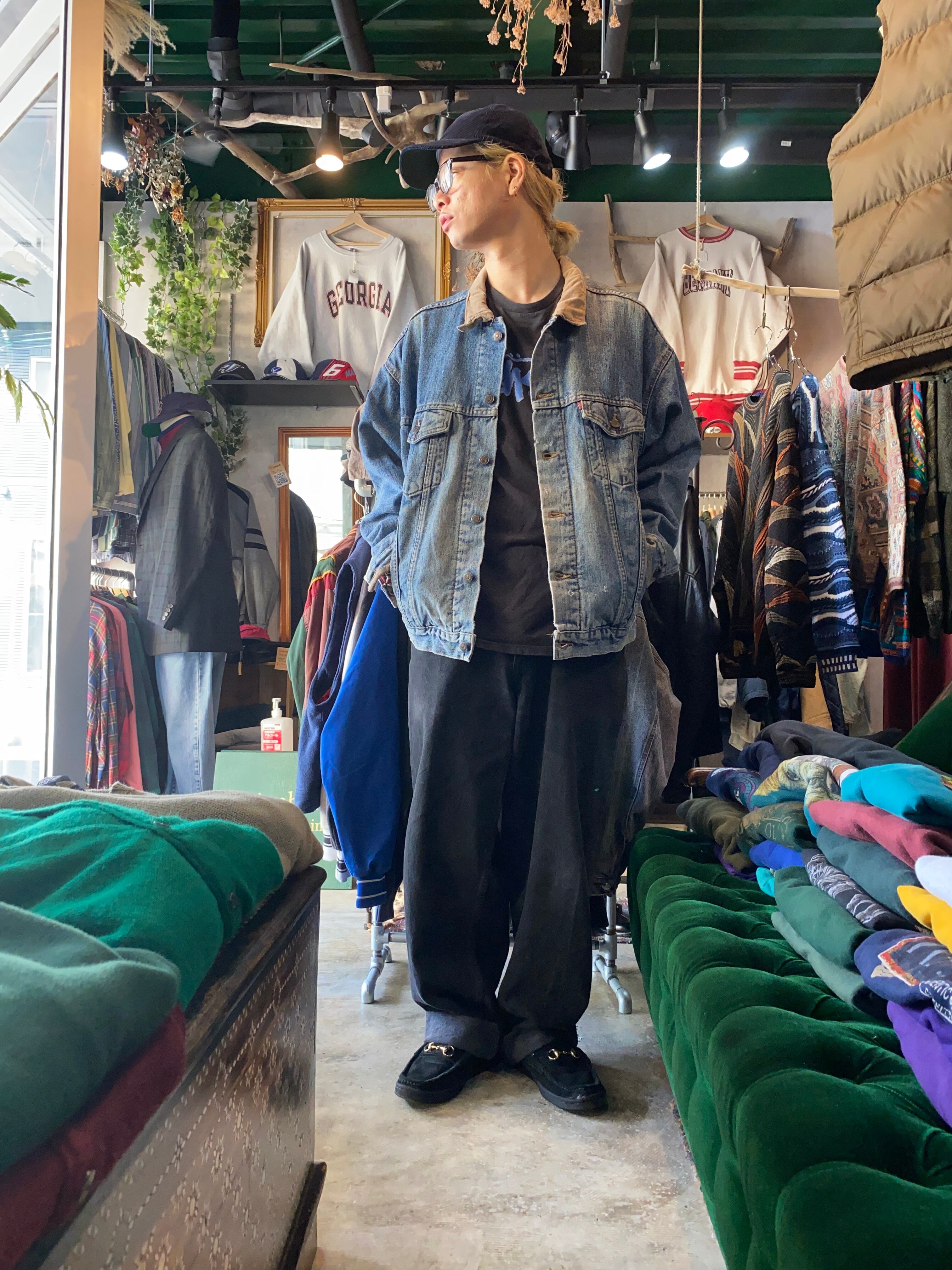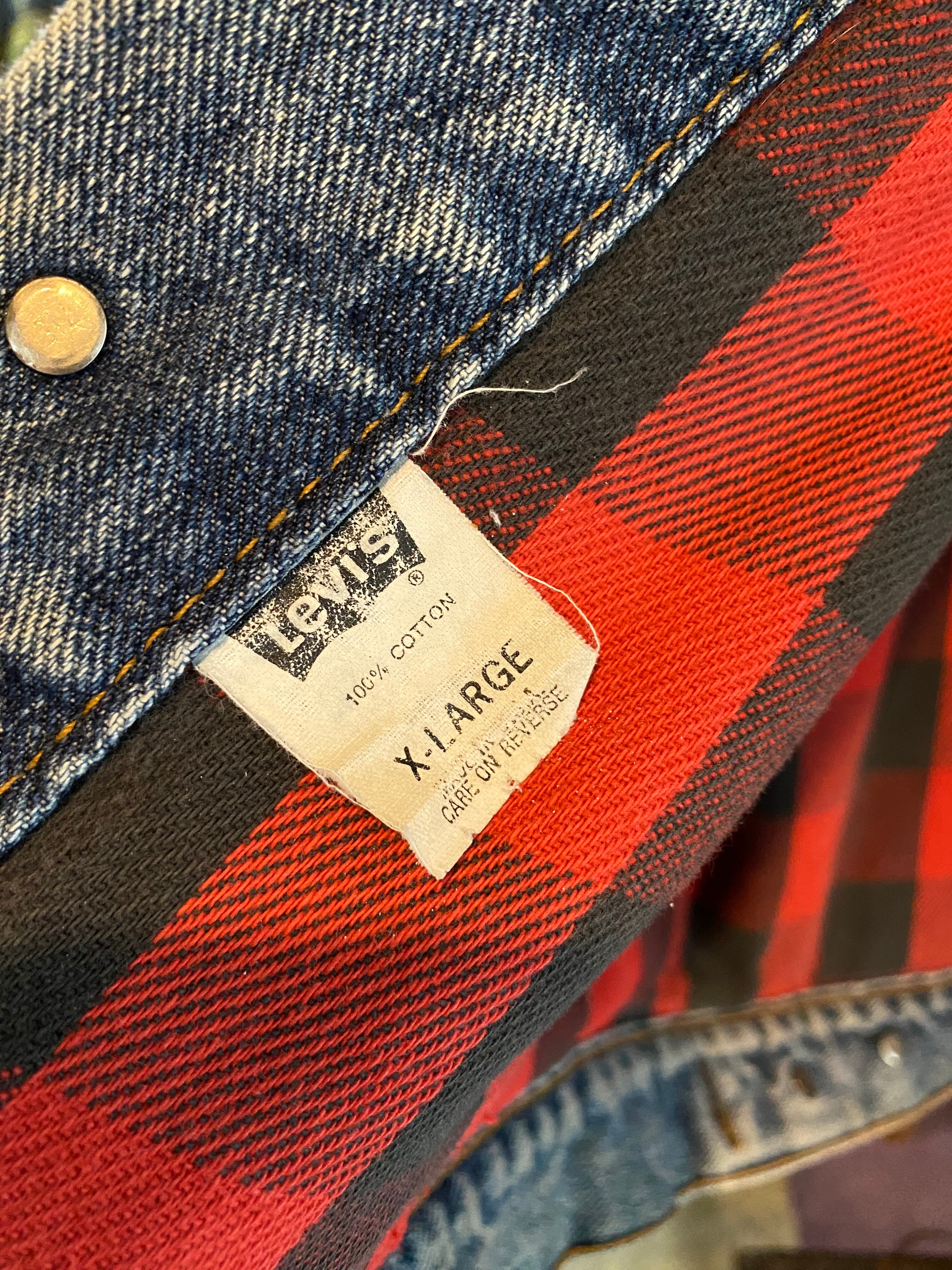 リーバイスのデニムジャケット。こちらはブロックチェックのネルライナーが付き、襟はコーデュロイ切り替えになった一着。王道アメカジにも、ストリートにも◎