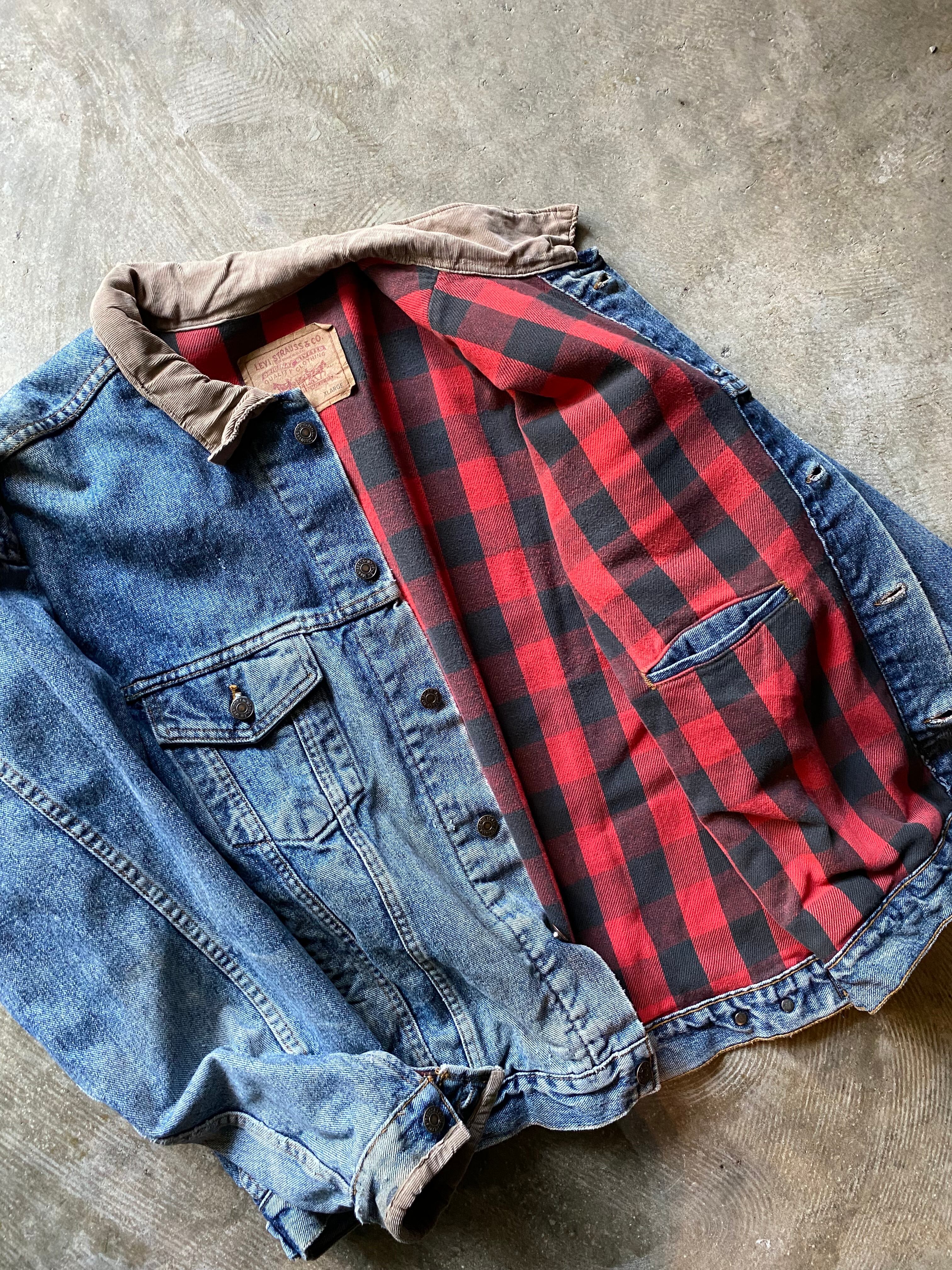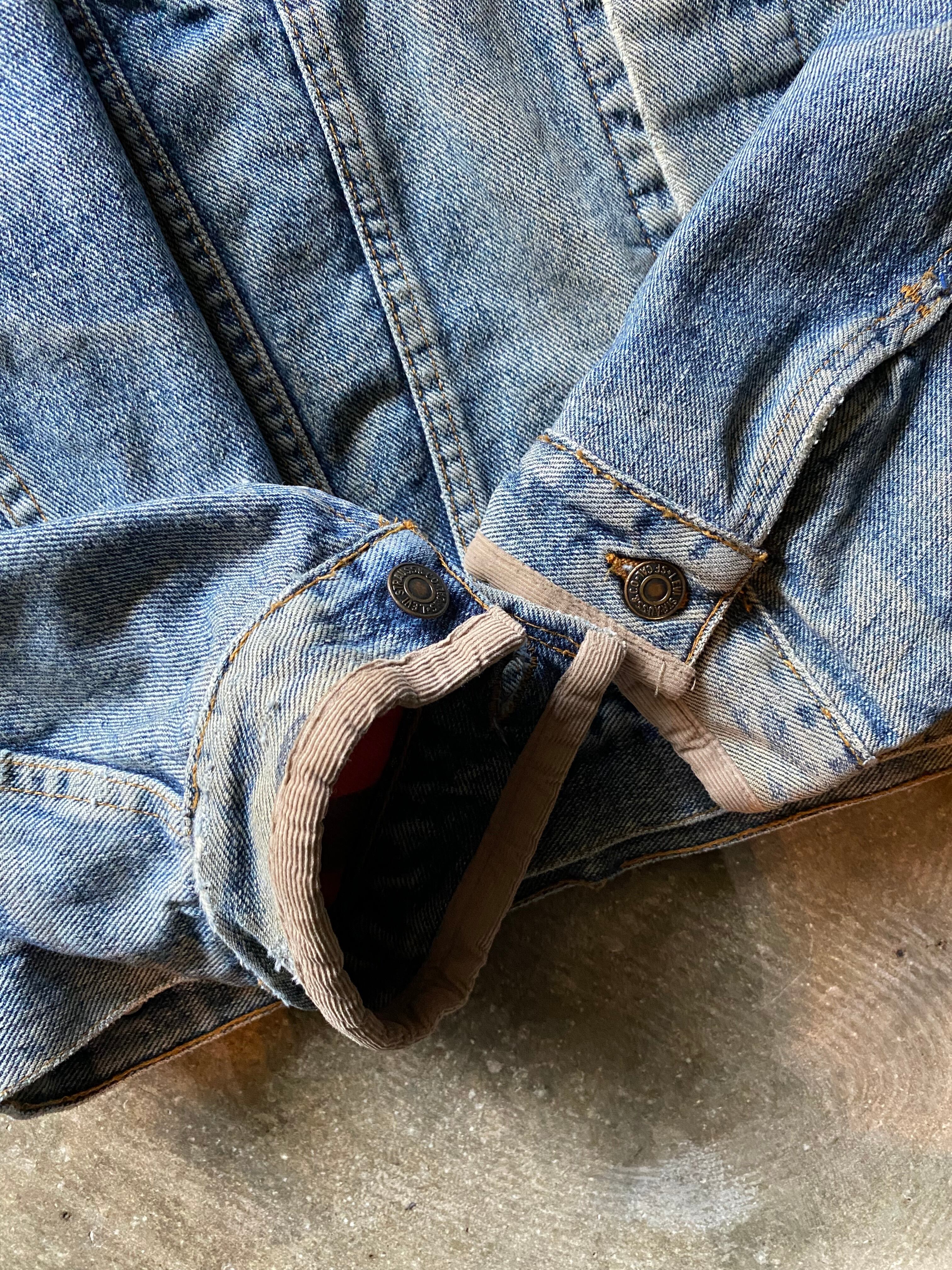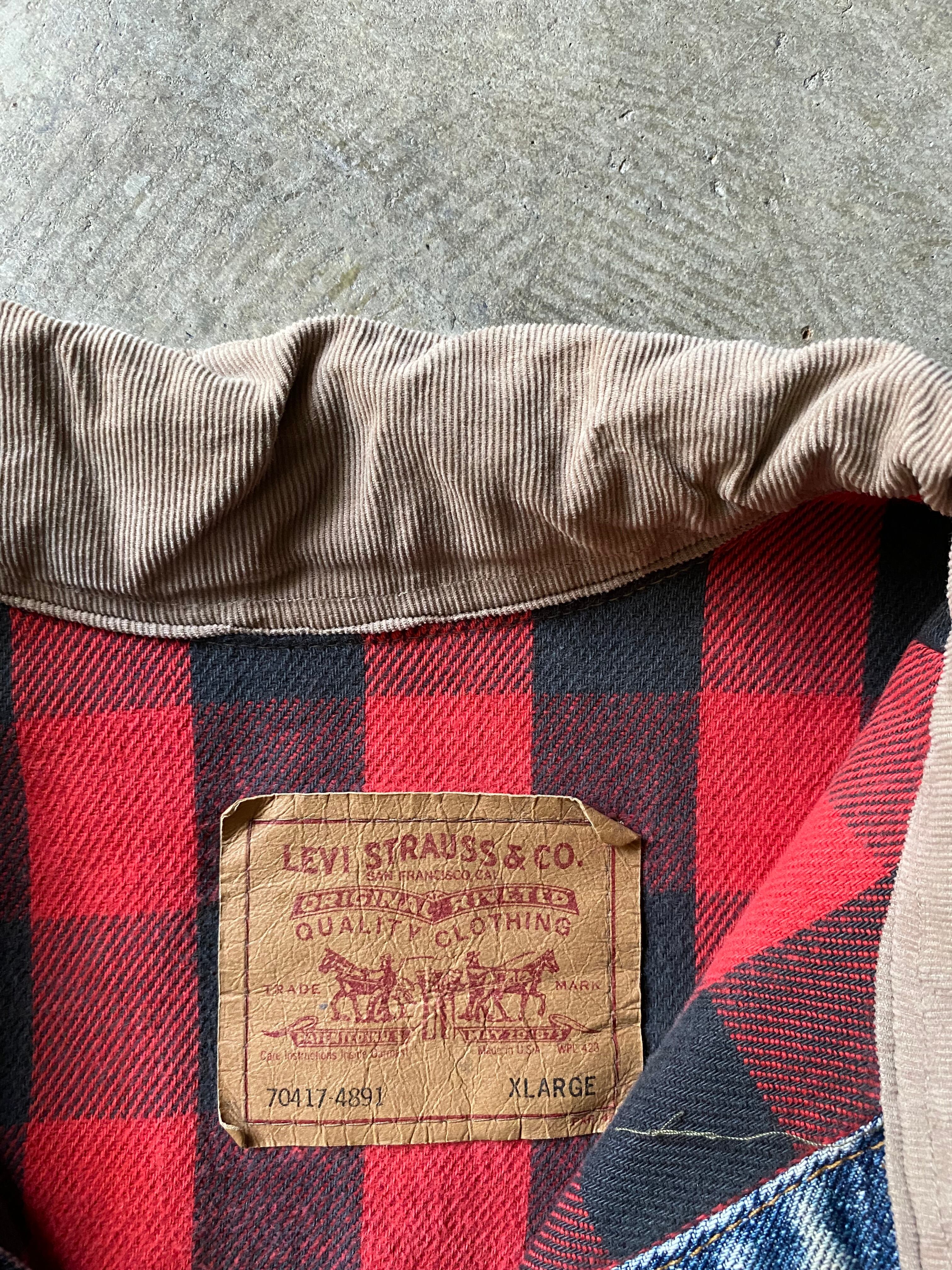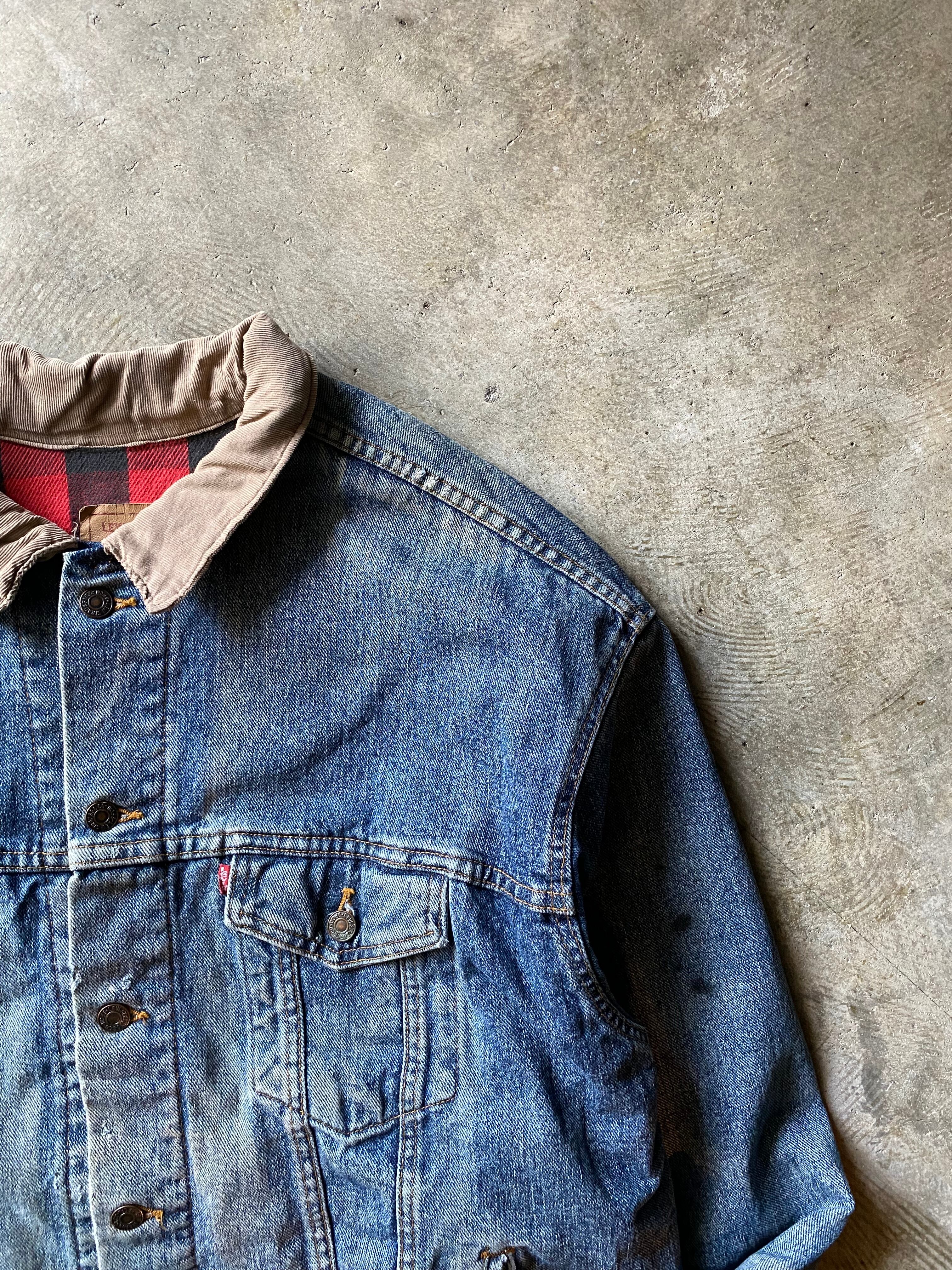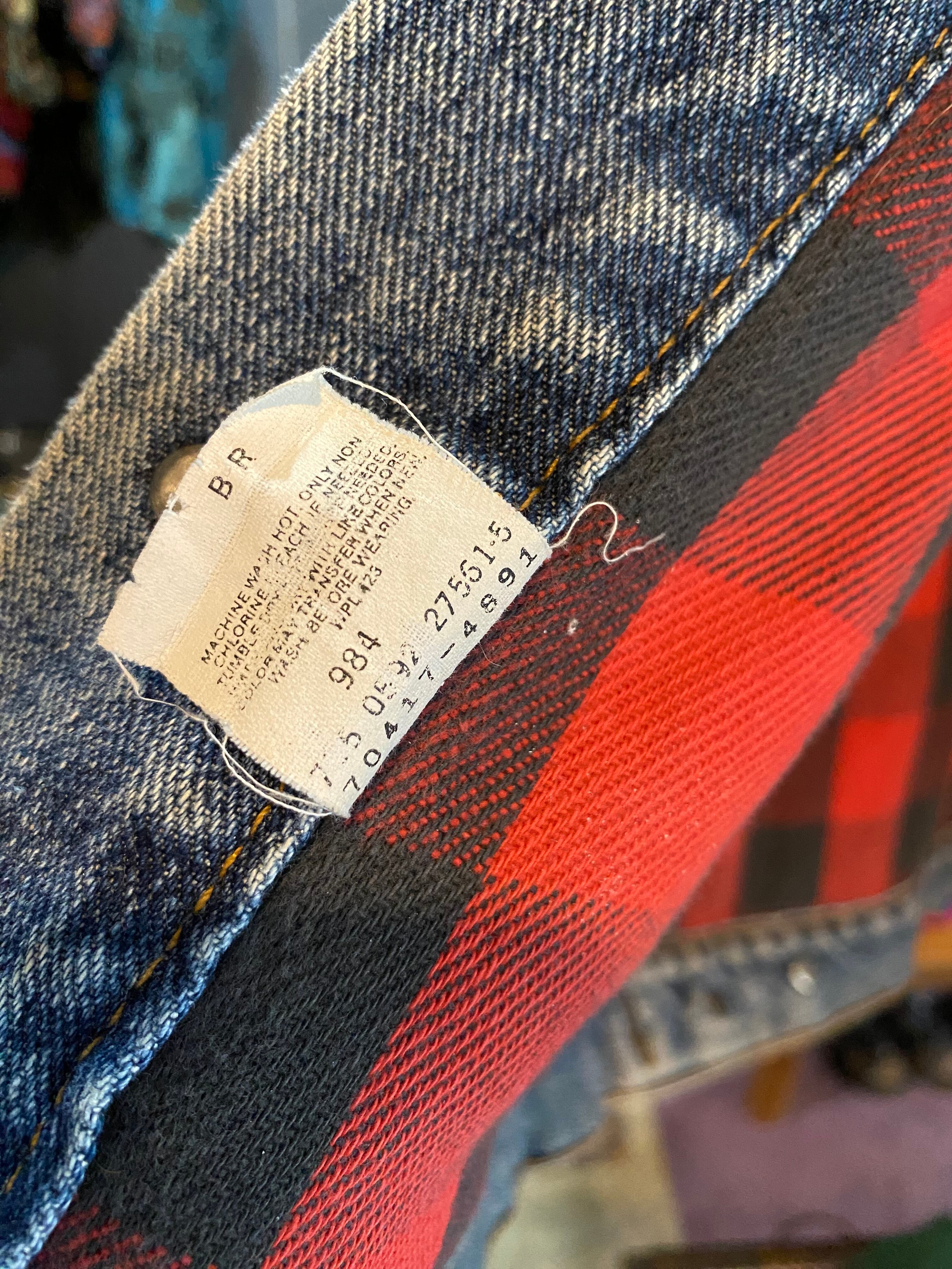 リーバイスのデニムジャケット。こちらはブロックチェックのネルライナーが付き、襟はコーデュロイ切り替えになった一着。王道アメカジにも、ストリートにも◎