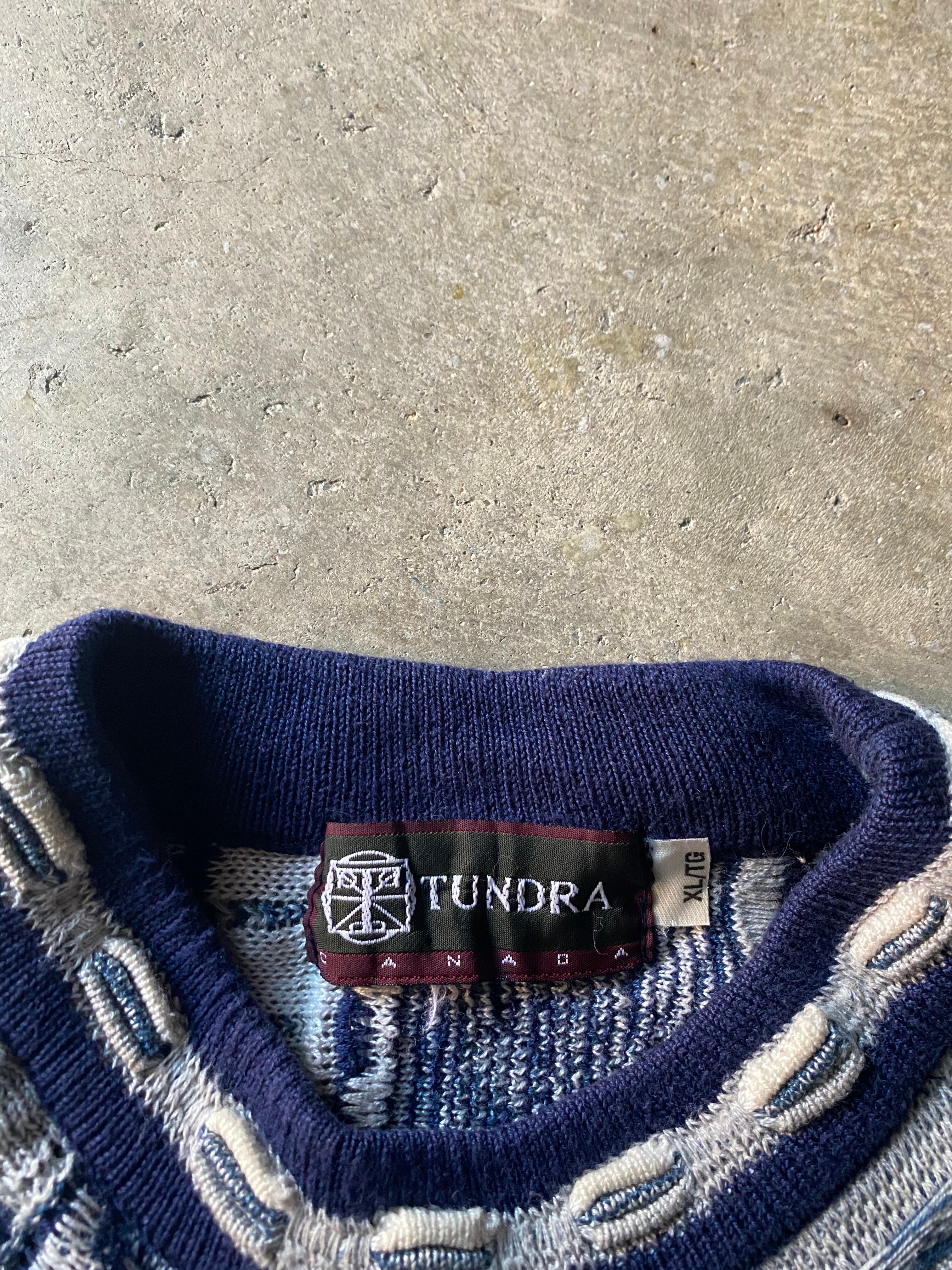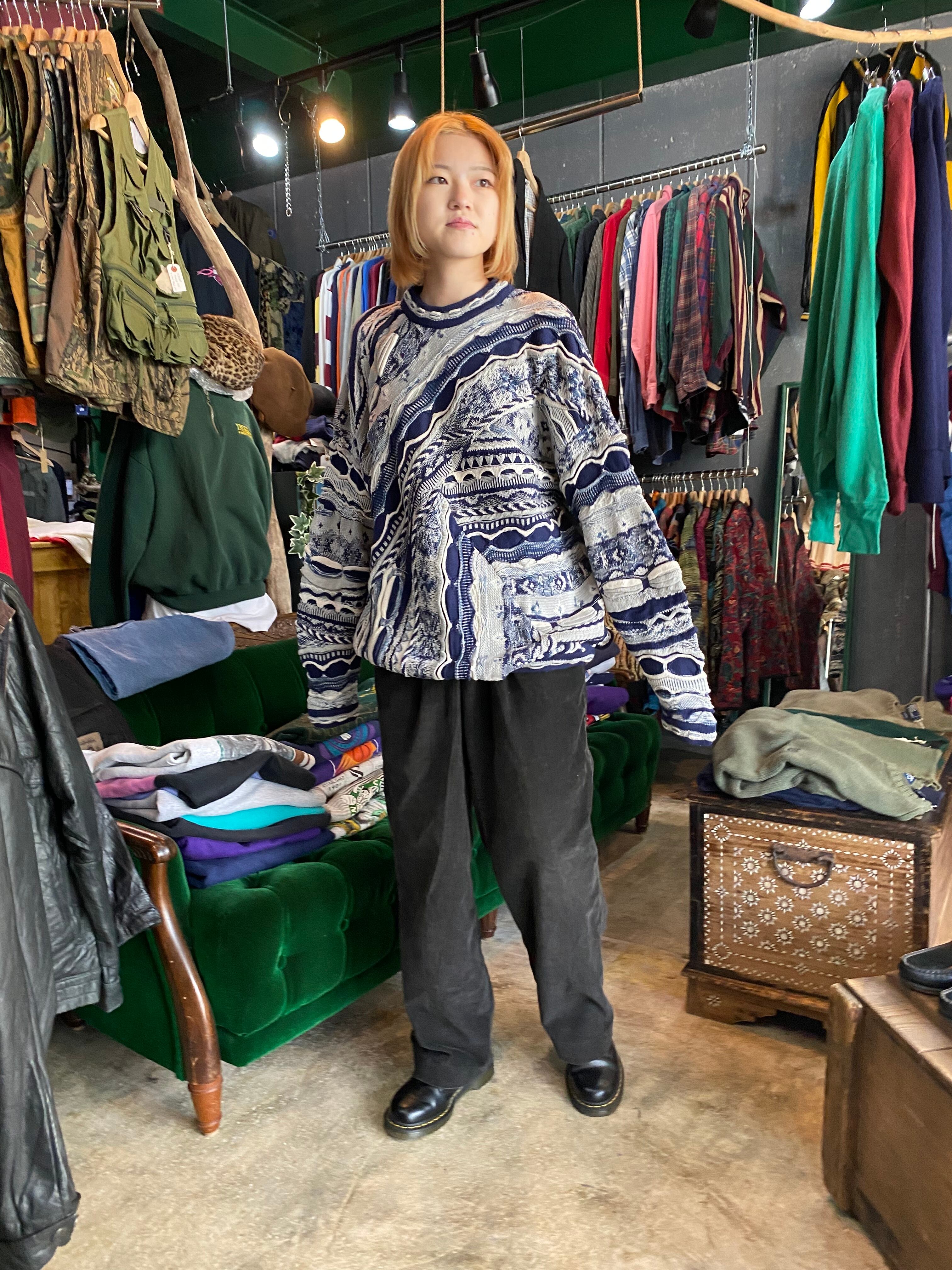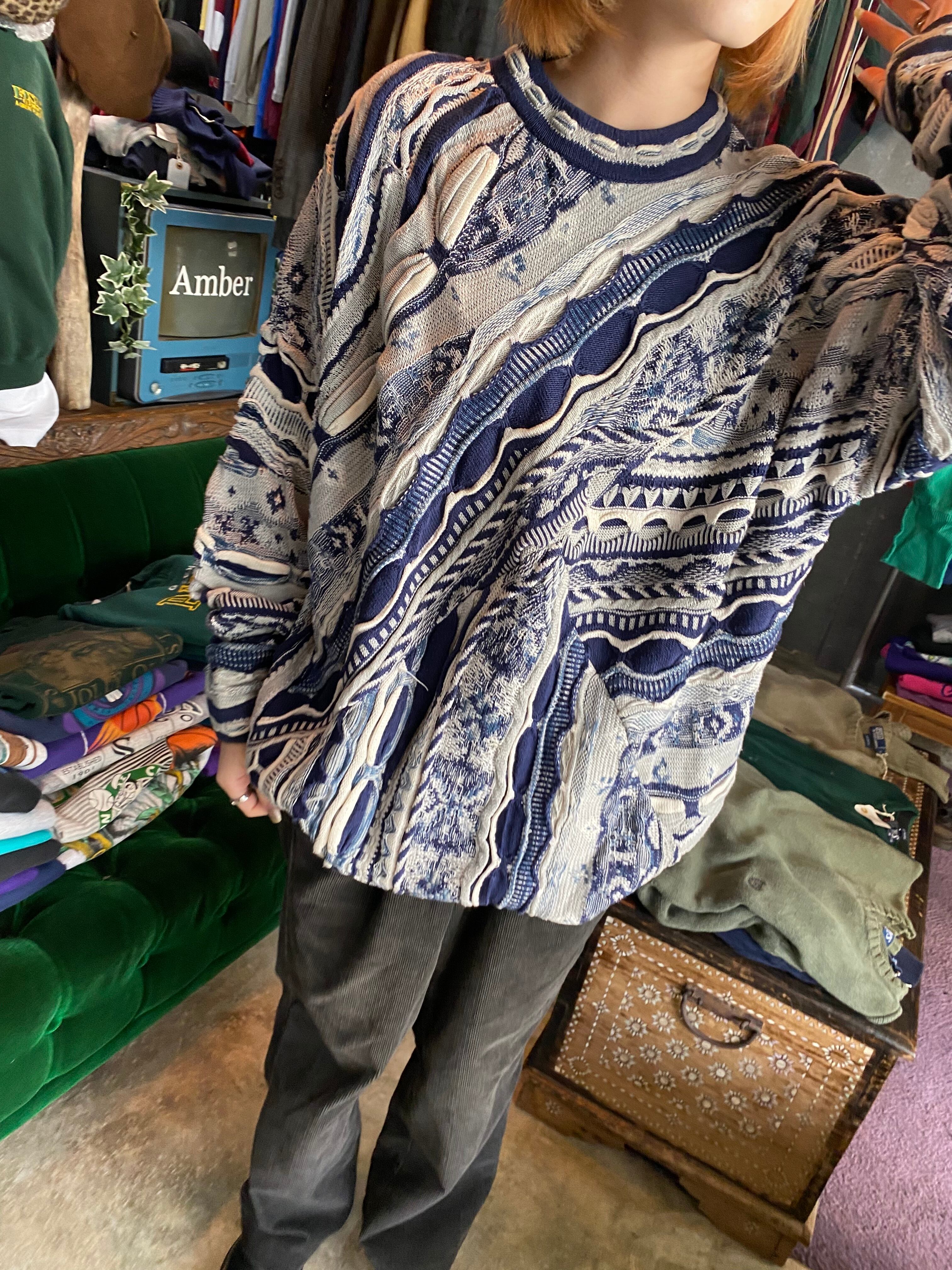 TUNDRAの3Dニット。前身頃でパターンが3方向に切り替わる独特な縫製。派手さは抑えているのに奇抜さは失わない大人な3Dニットです。
