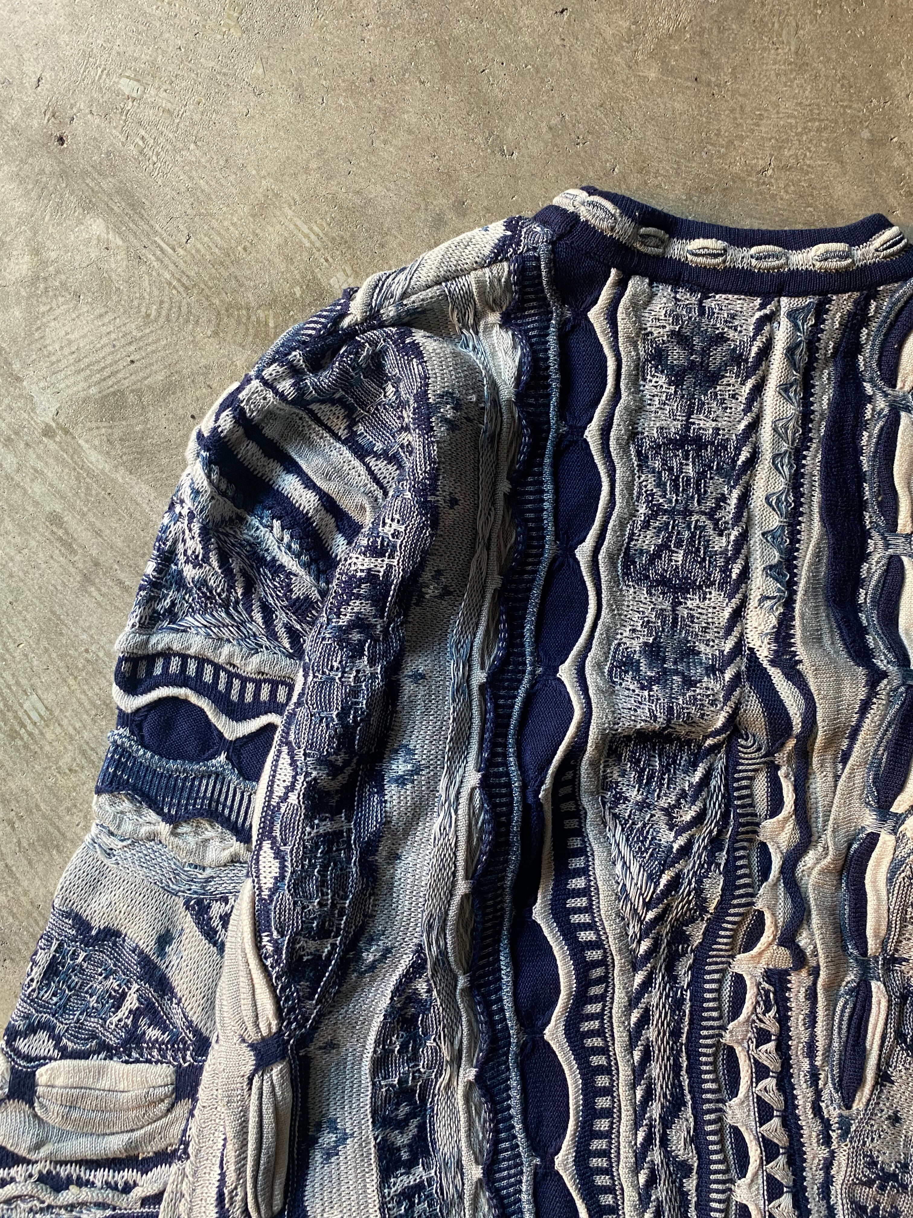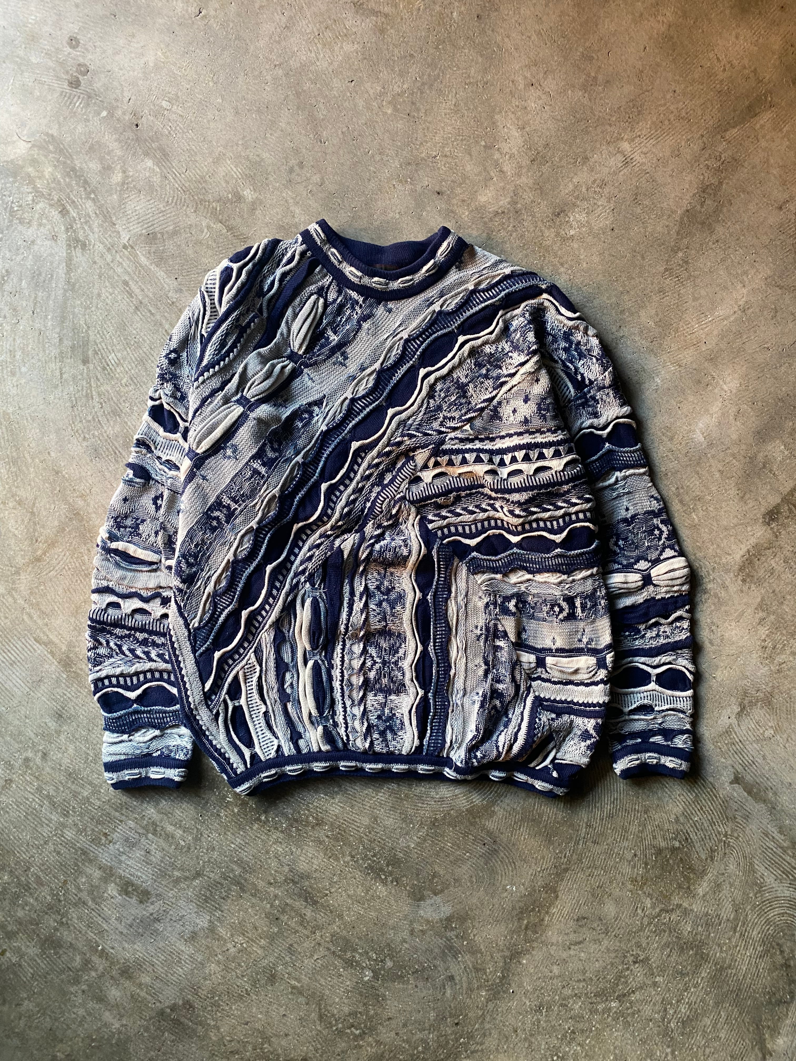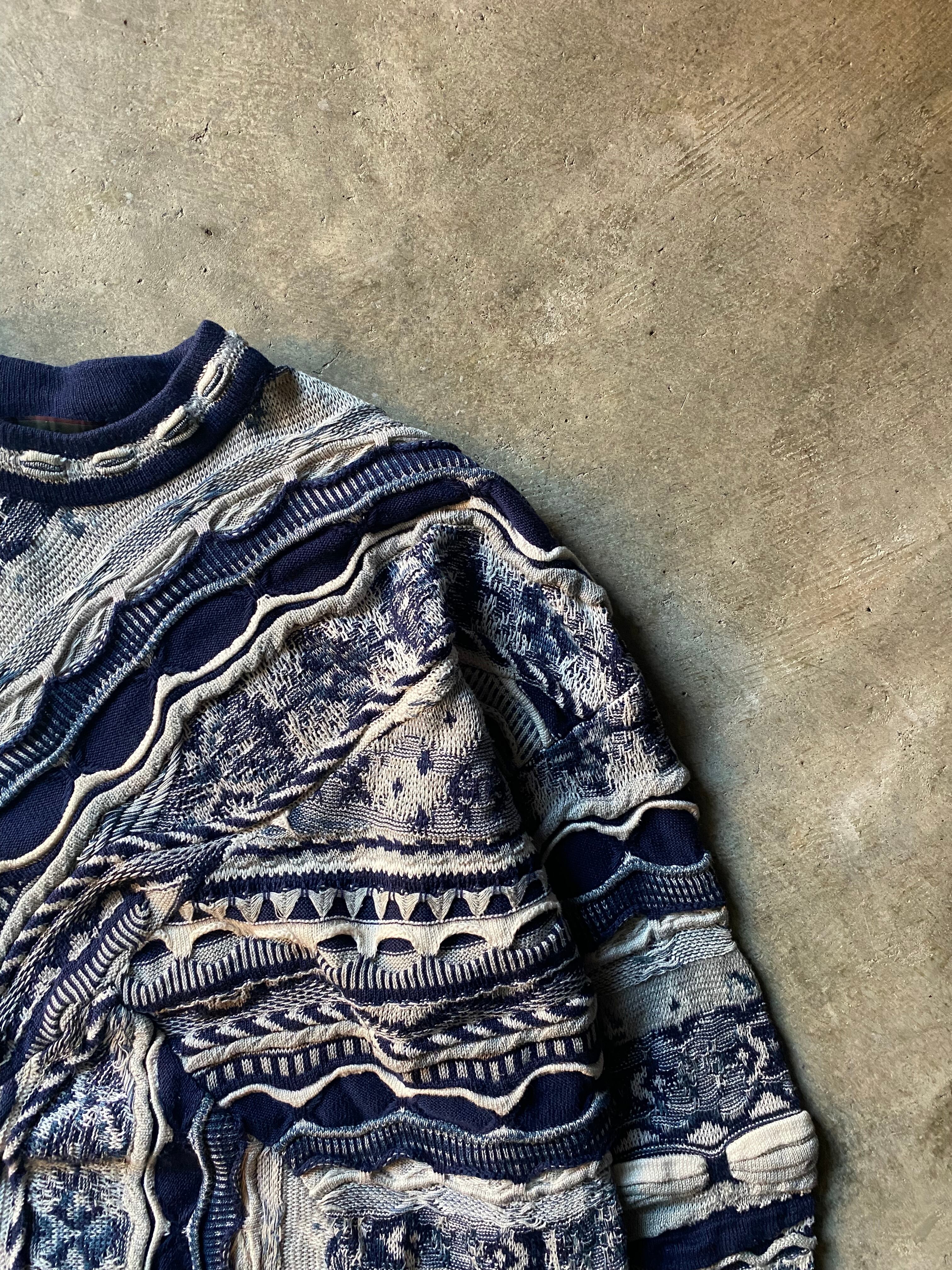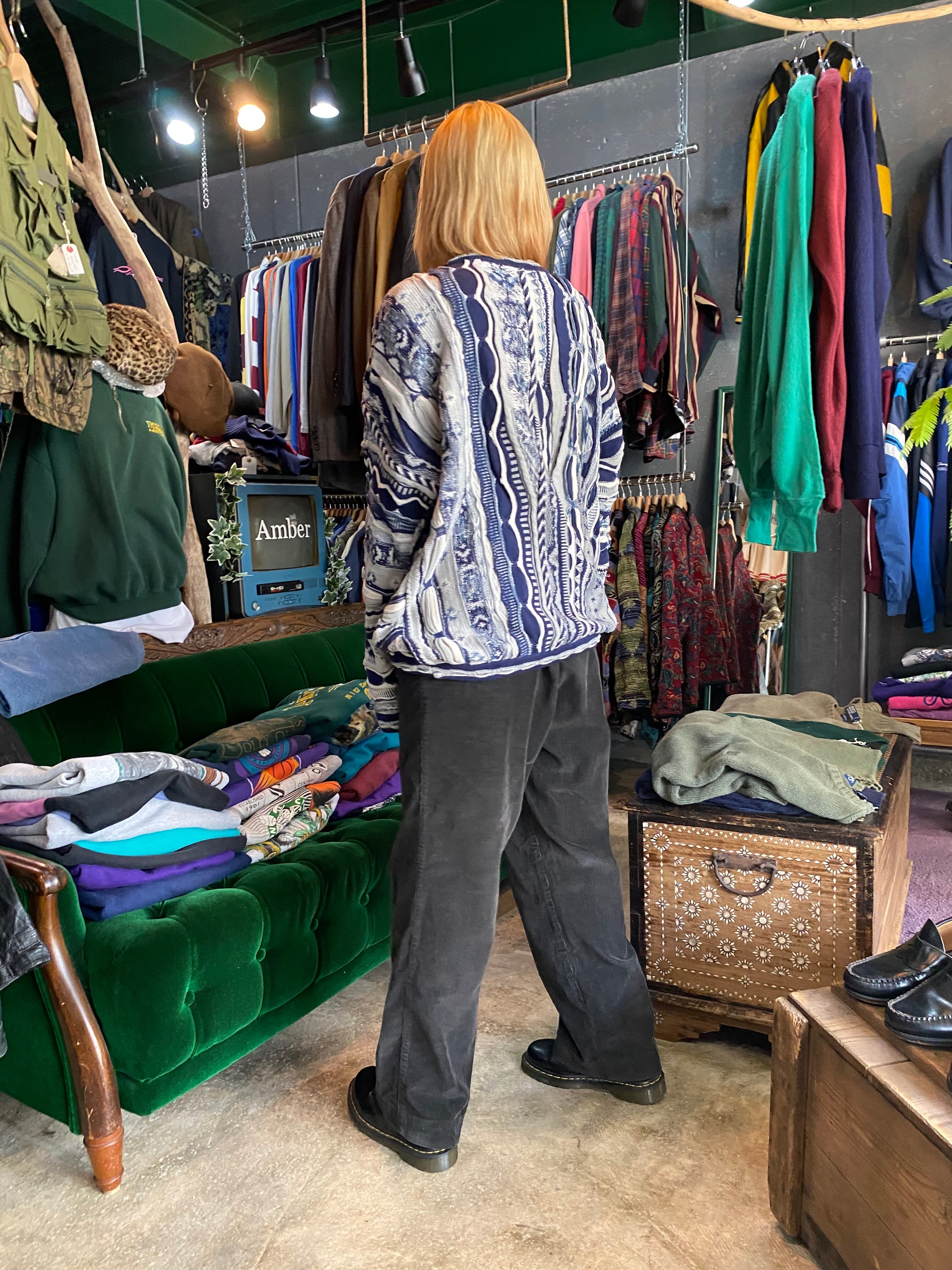 TUNDRAの3Dニット。前身頃でパターンが3方向に切り替わる独特な縫製。派手さは抑えているのに奇抜さは失わない大人な3Dニットです。