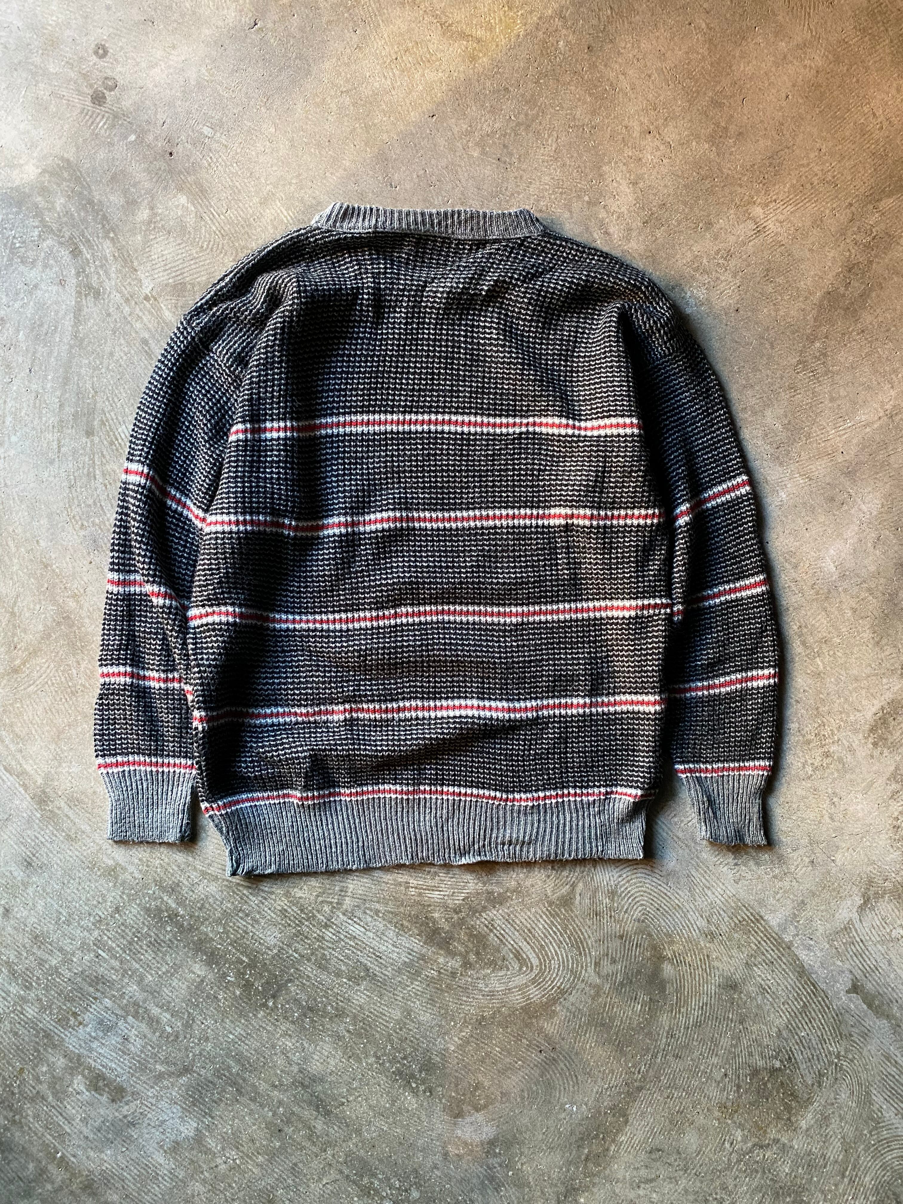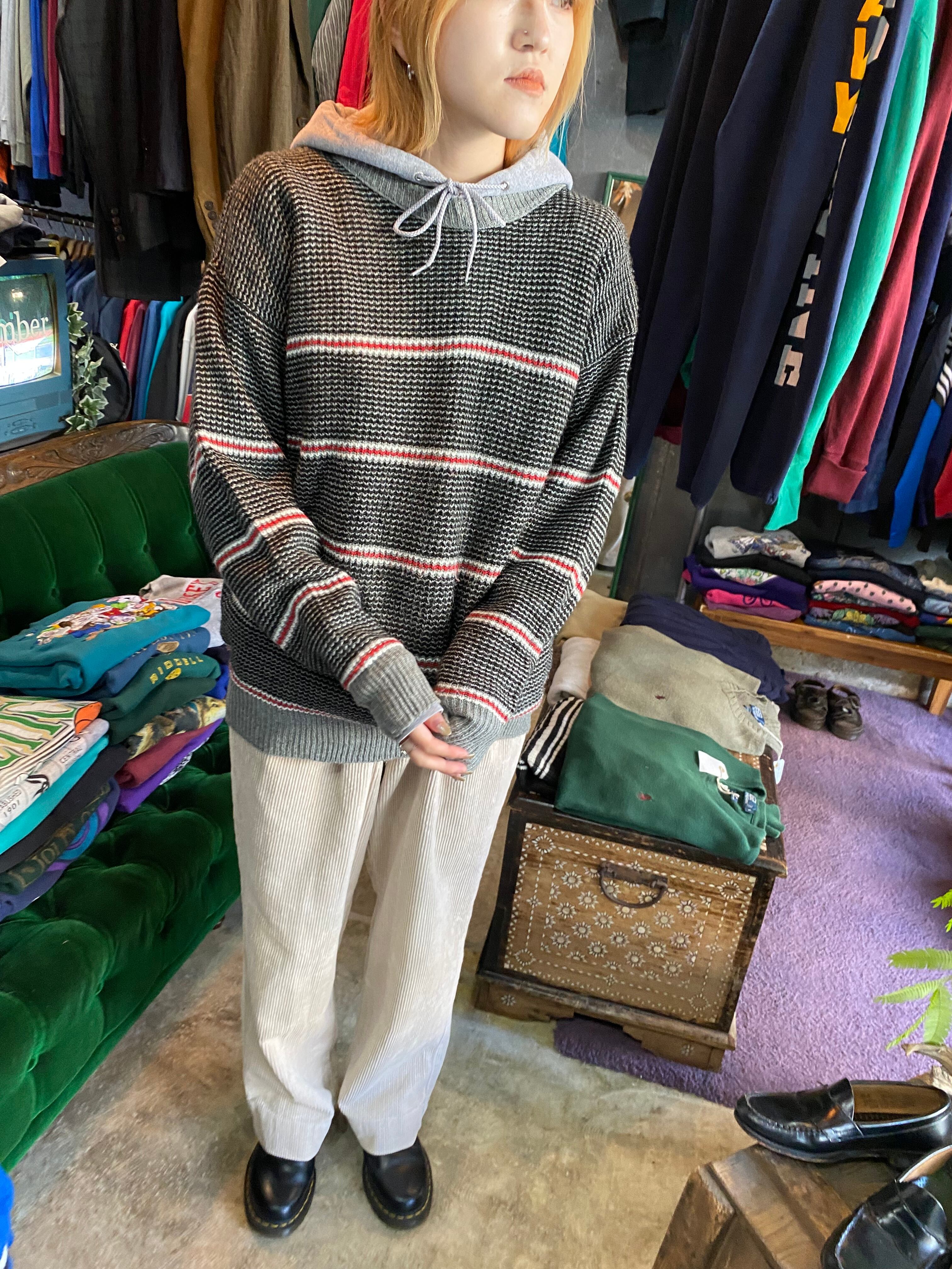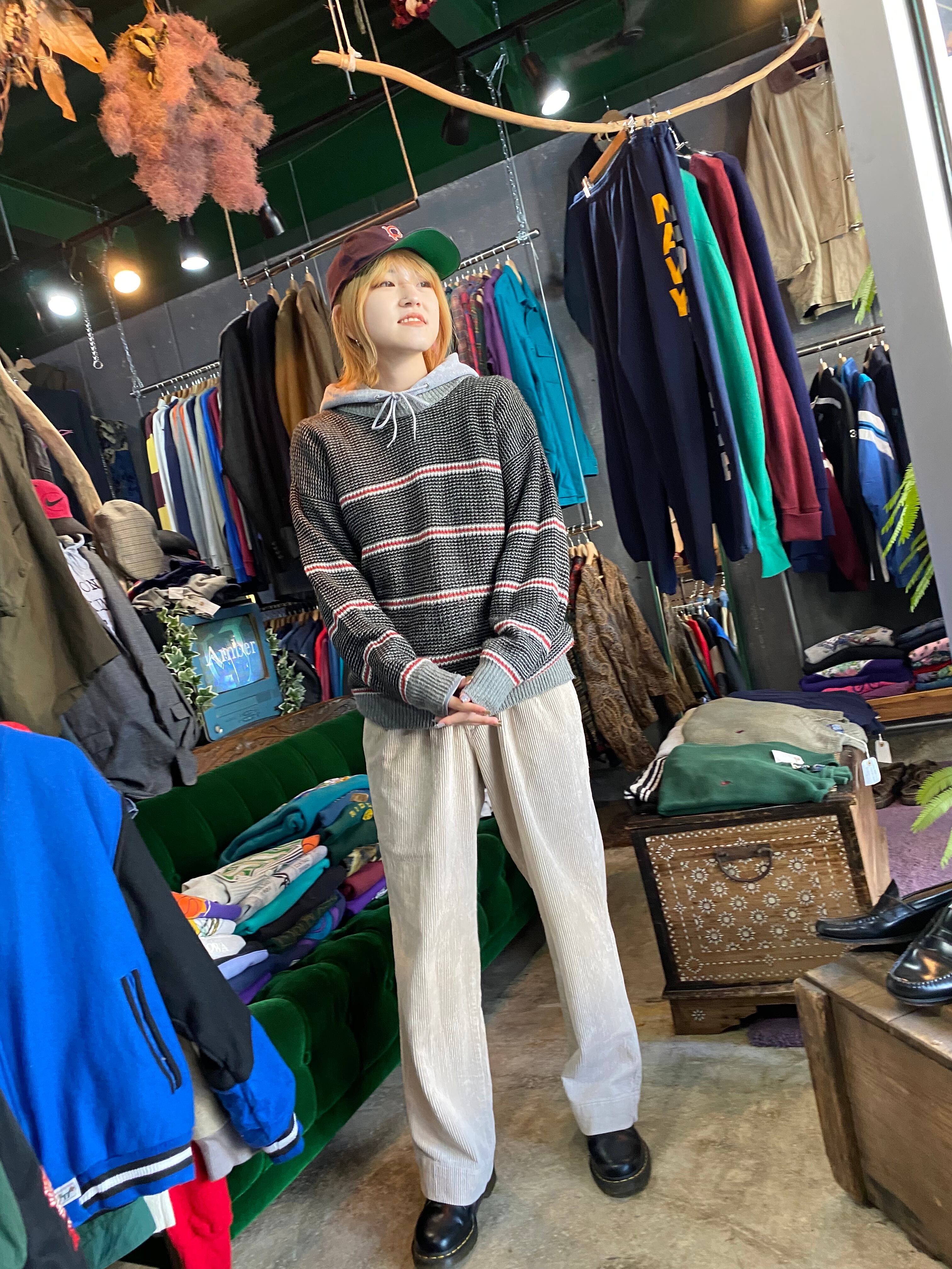 バーズアイのような柄のレトロなニット。ボーダーがいい感じのアクセントになってます。
