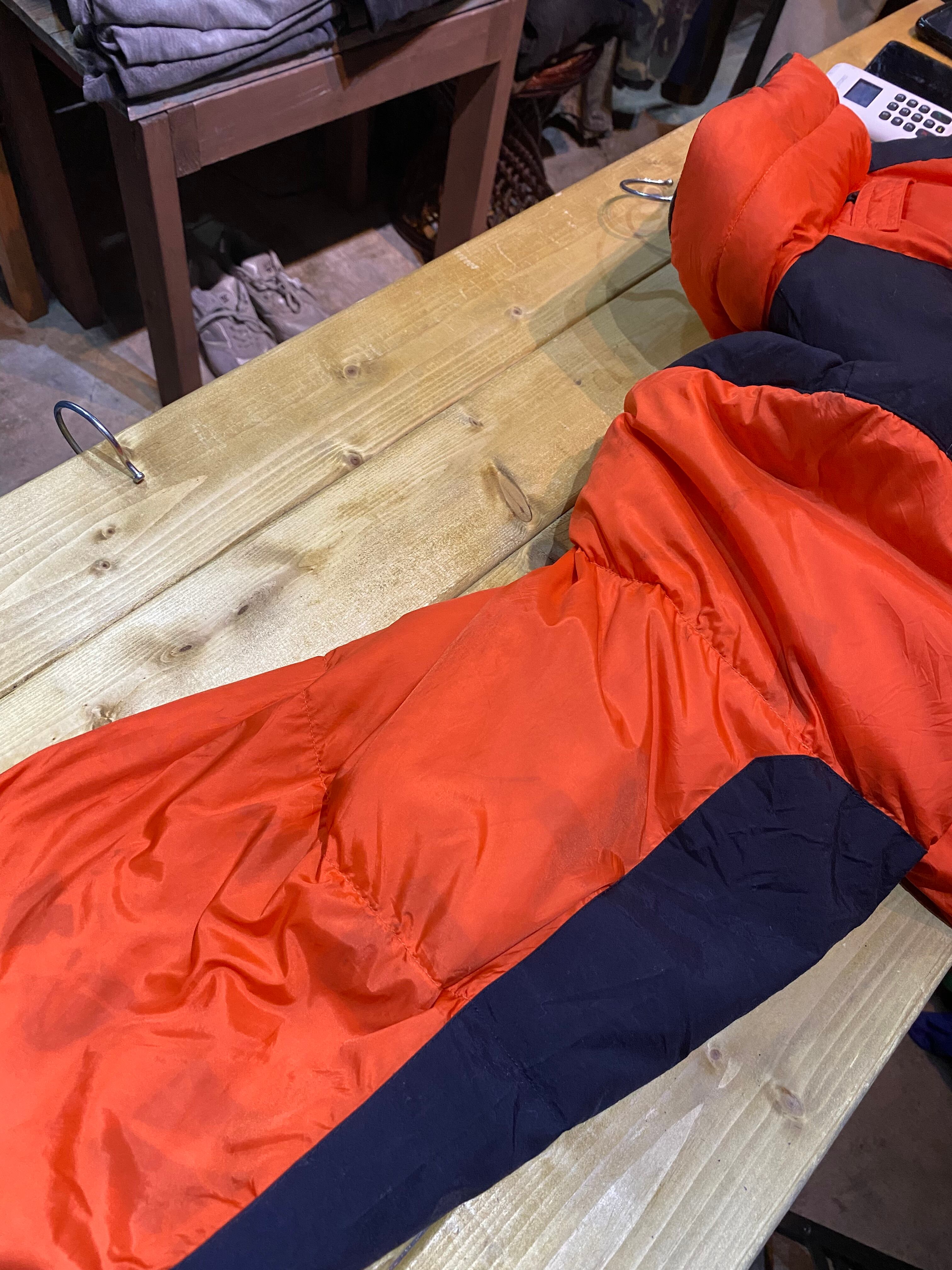 所々薄黒く色移りがあります(写真最後2枚)その他少し使用感はありますが着用に問題は無く、ダウンもしっかり入って良い状態です。