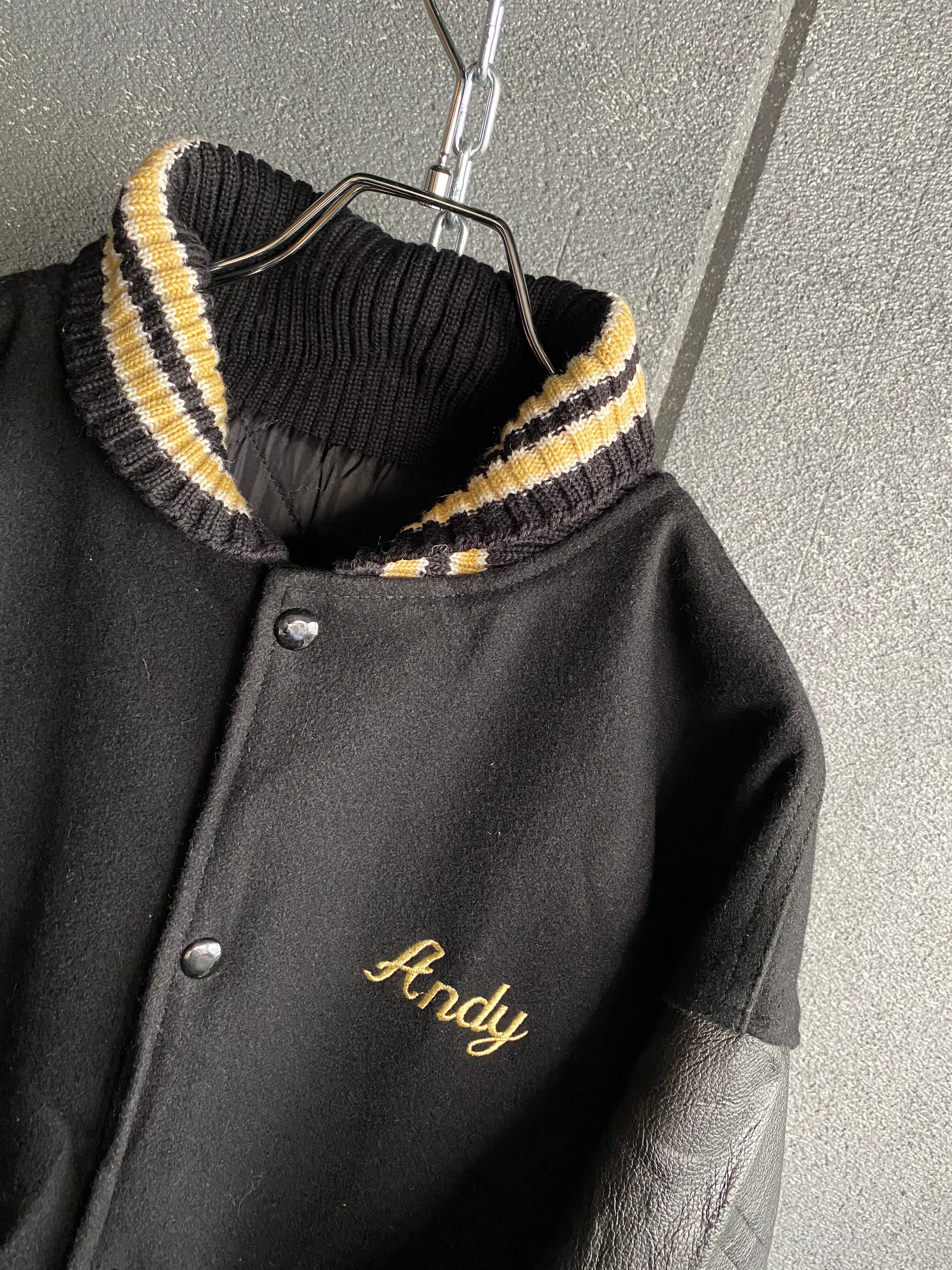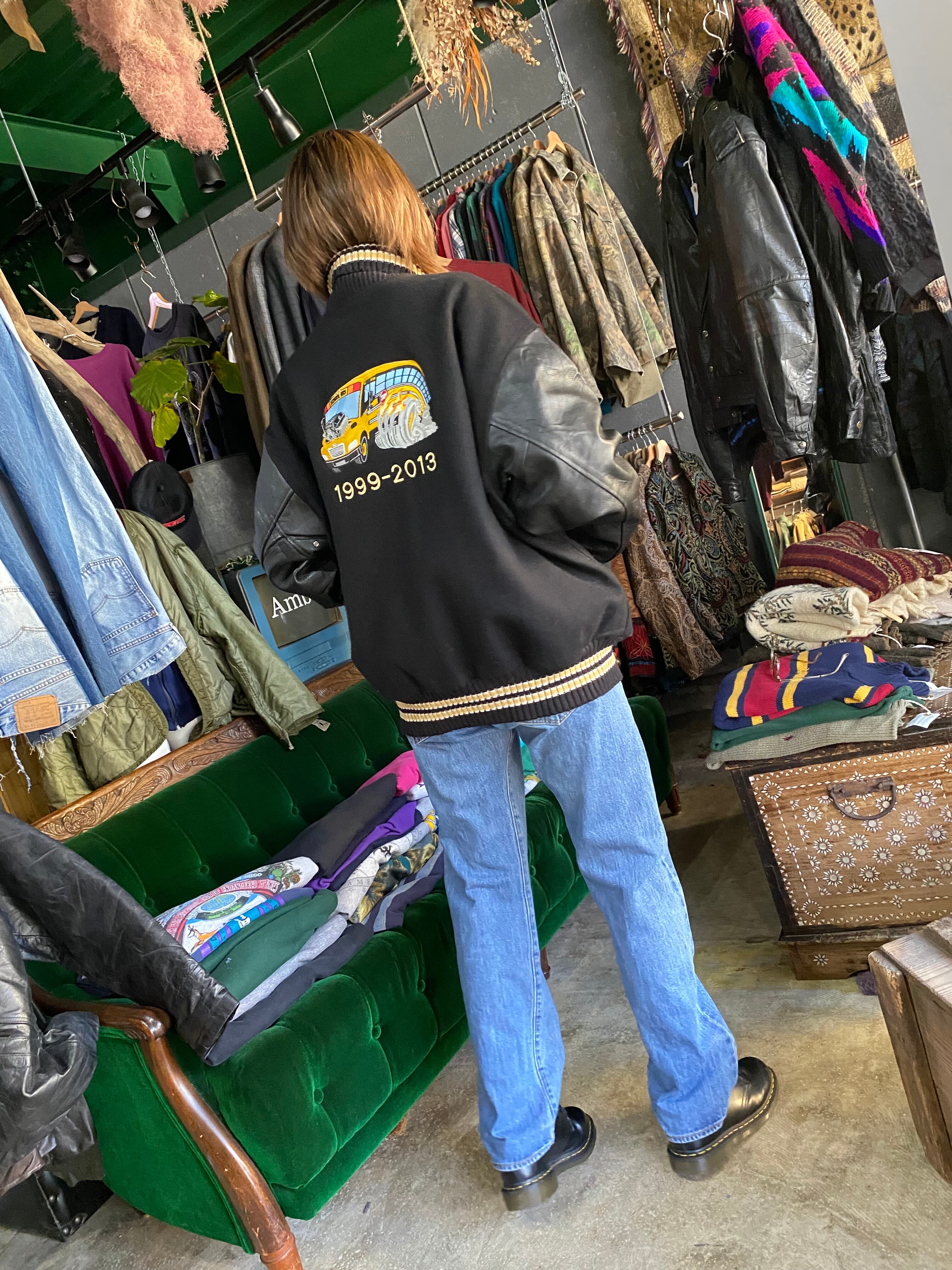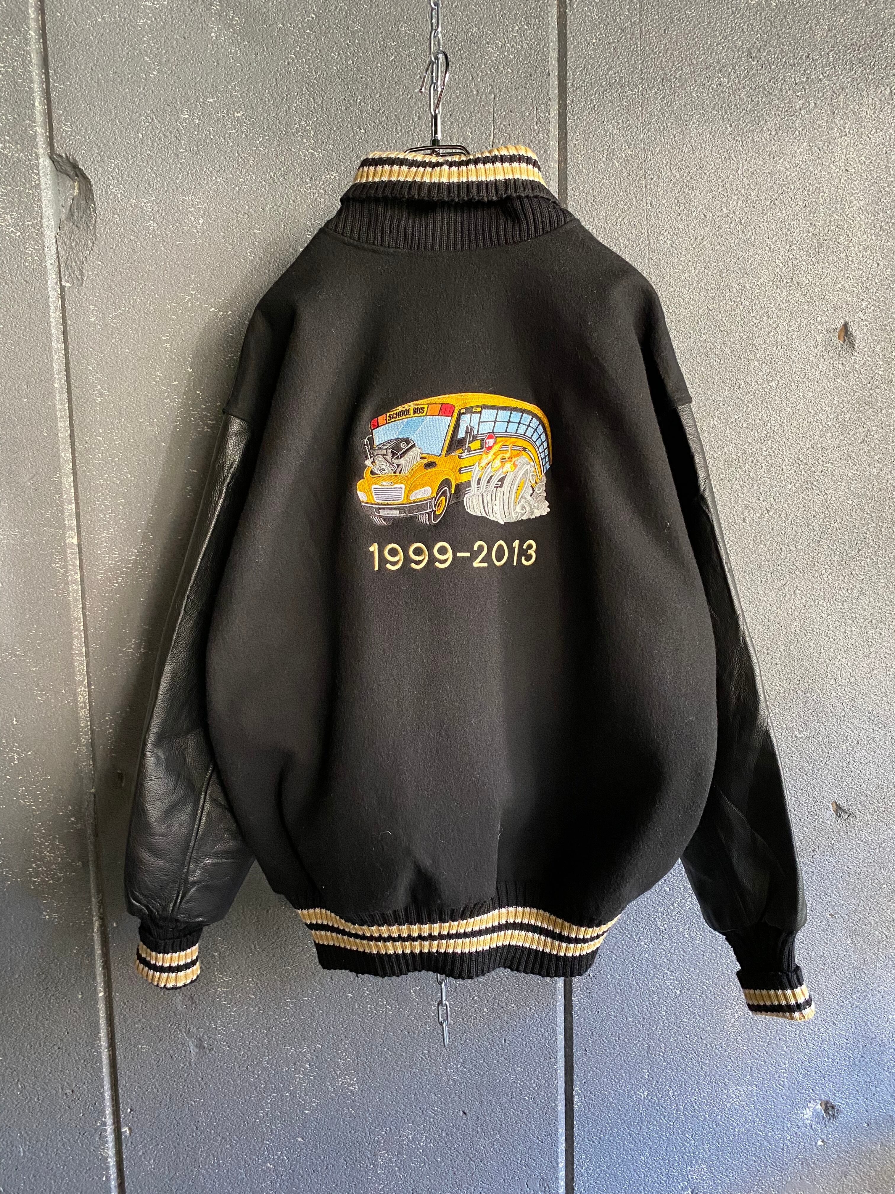 爆走するスクールバスが背中に刺繍されたスタジャン。ボディのメルトン部分もスリーブのリアルレザーも状態が良く、エイジングが楽しみな一着です。