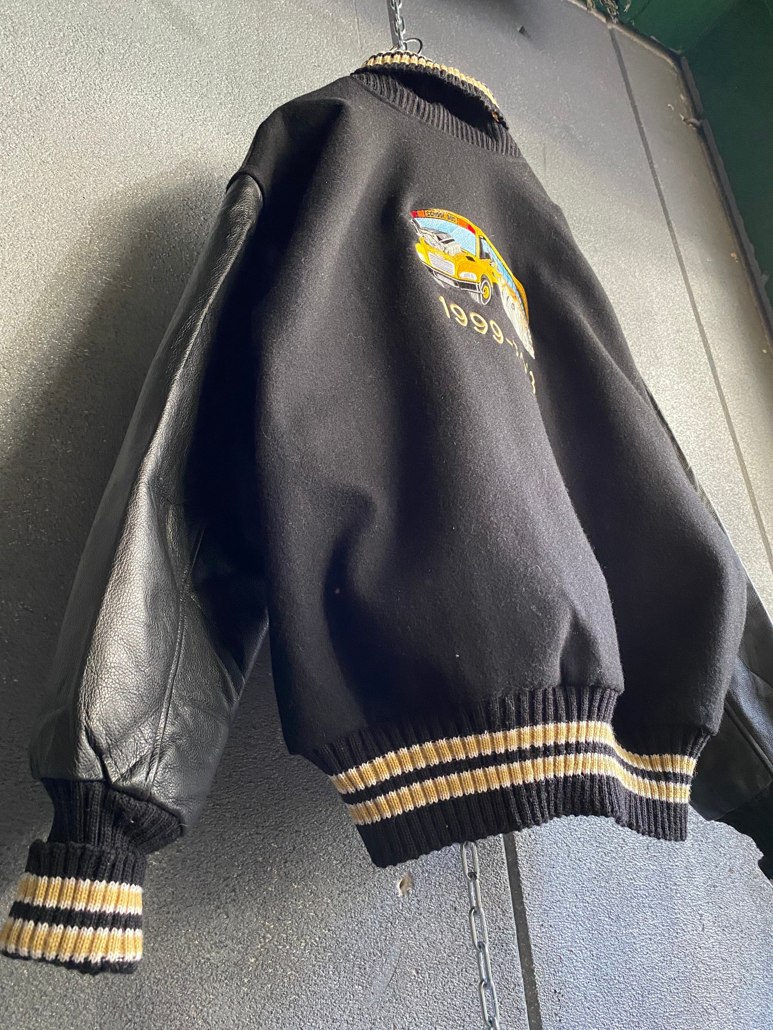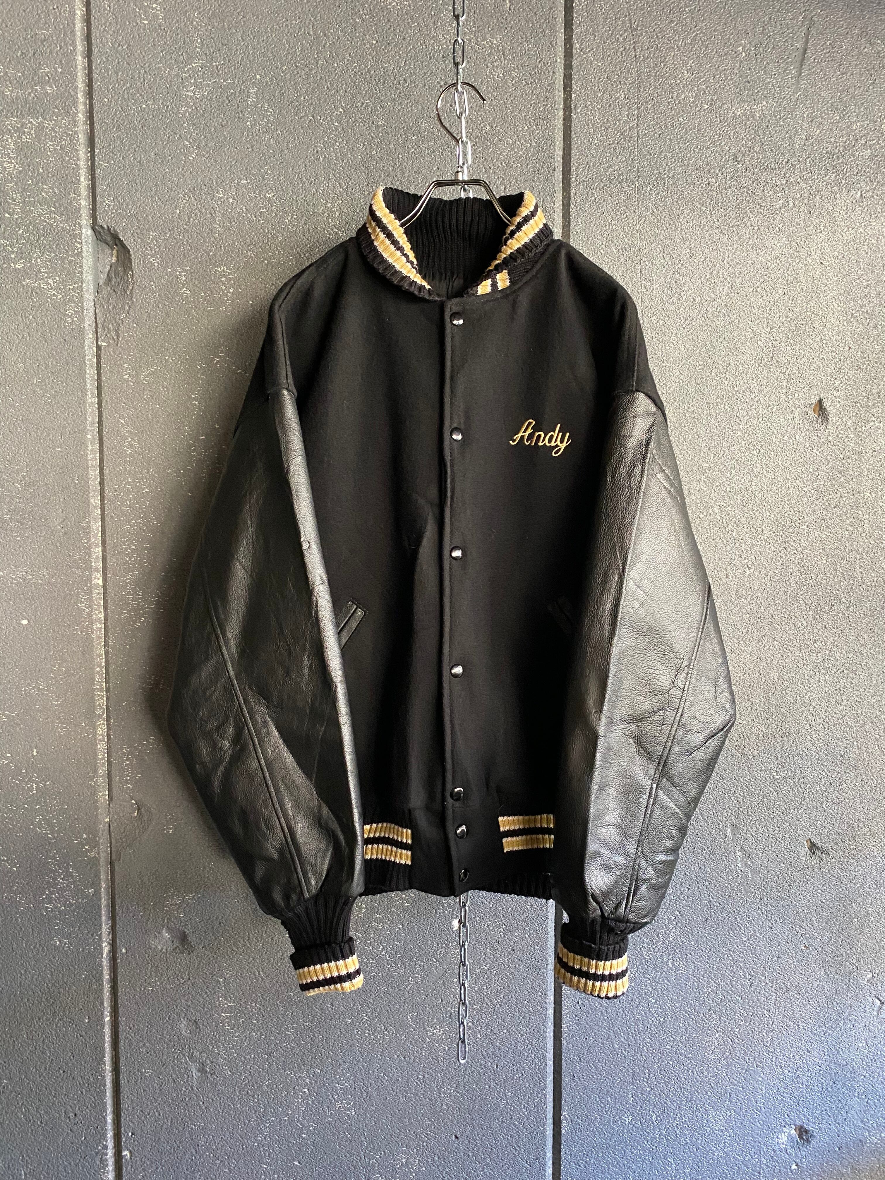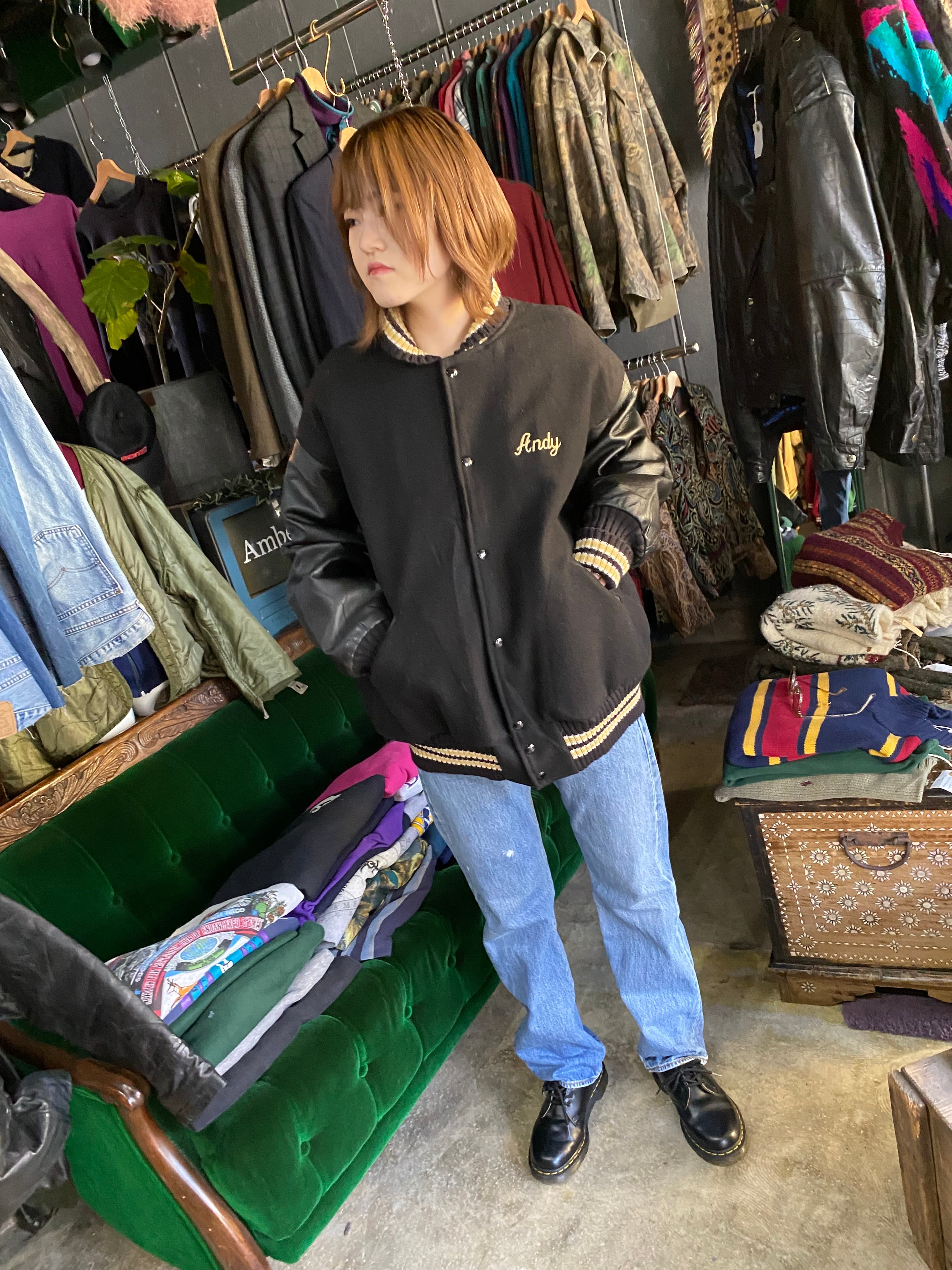 爆走するスクールバスが背中に刺繍されたスタジャン。ボディのメルトン部分もスリーブのリアルレザーも状態が良く、エイジングが楽しみな一着です。