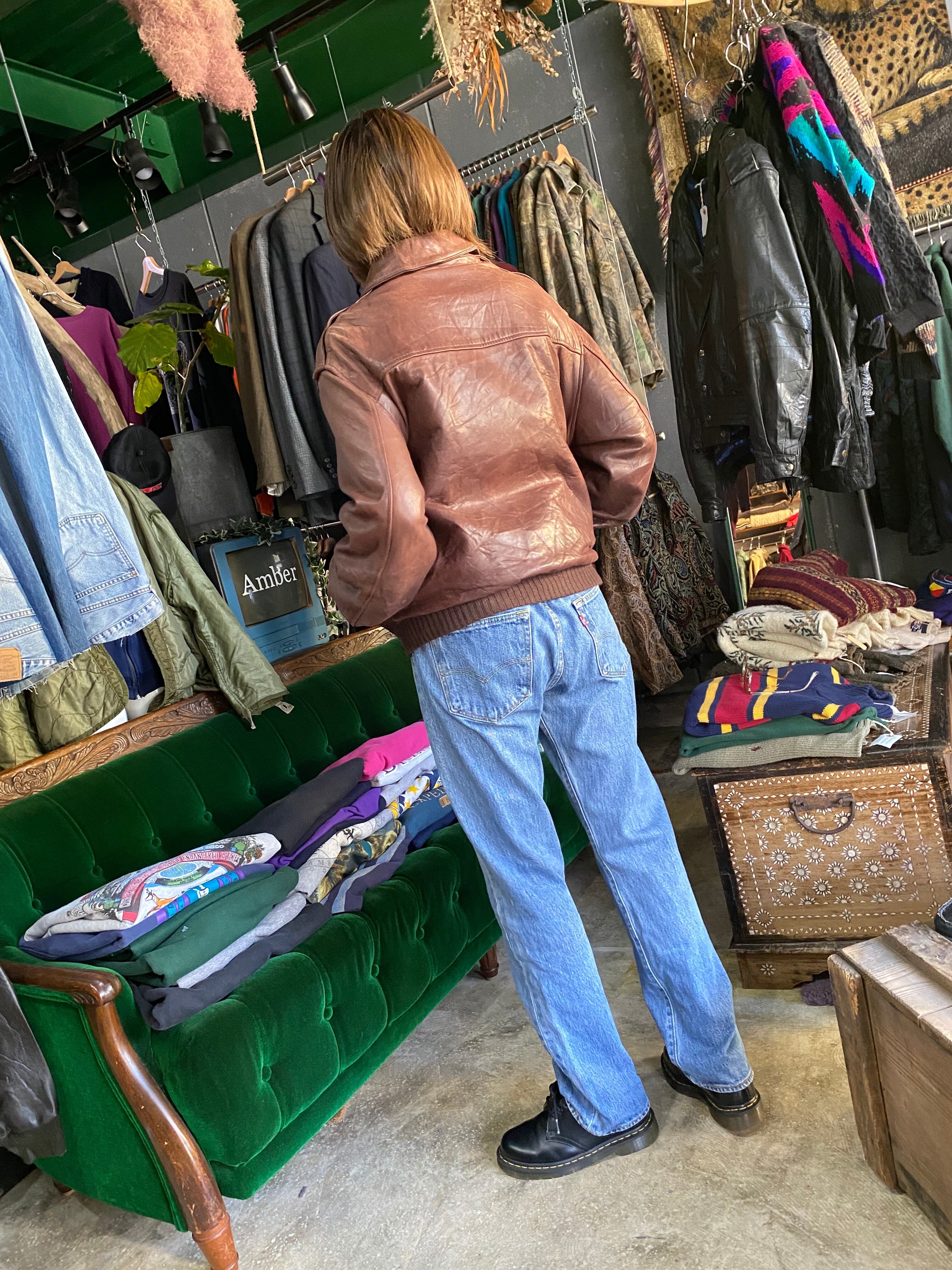アヴィレックスのA-2。独特の柔らかさと風合いのあるホースハイドを使用したブラウンカラーの一着。写真のようなLevi's501を合わせた無骨なアメカジスタイルや、シャツとスラックスでドレスに着るのもオススメです◎