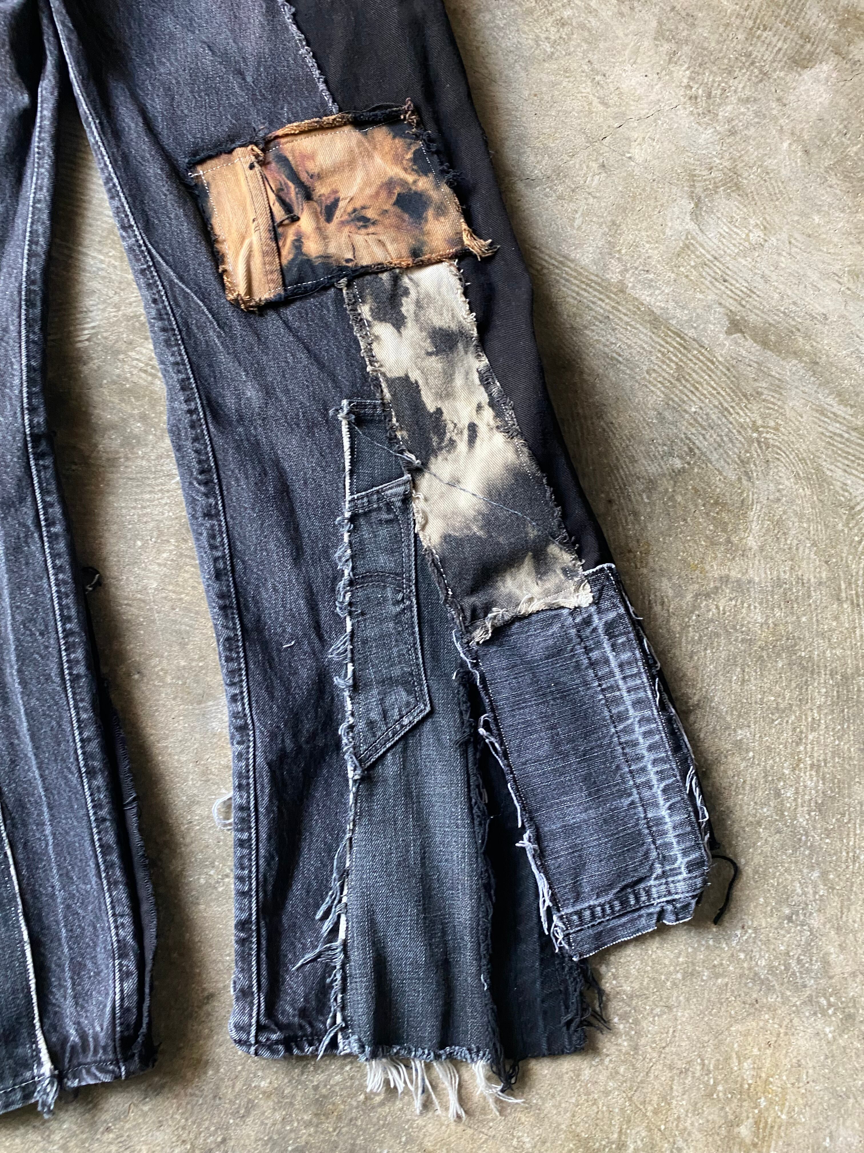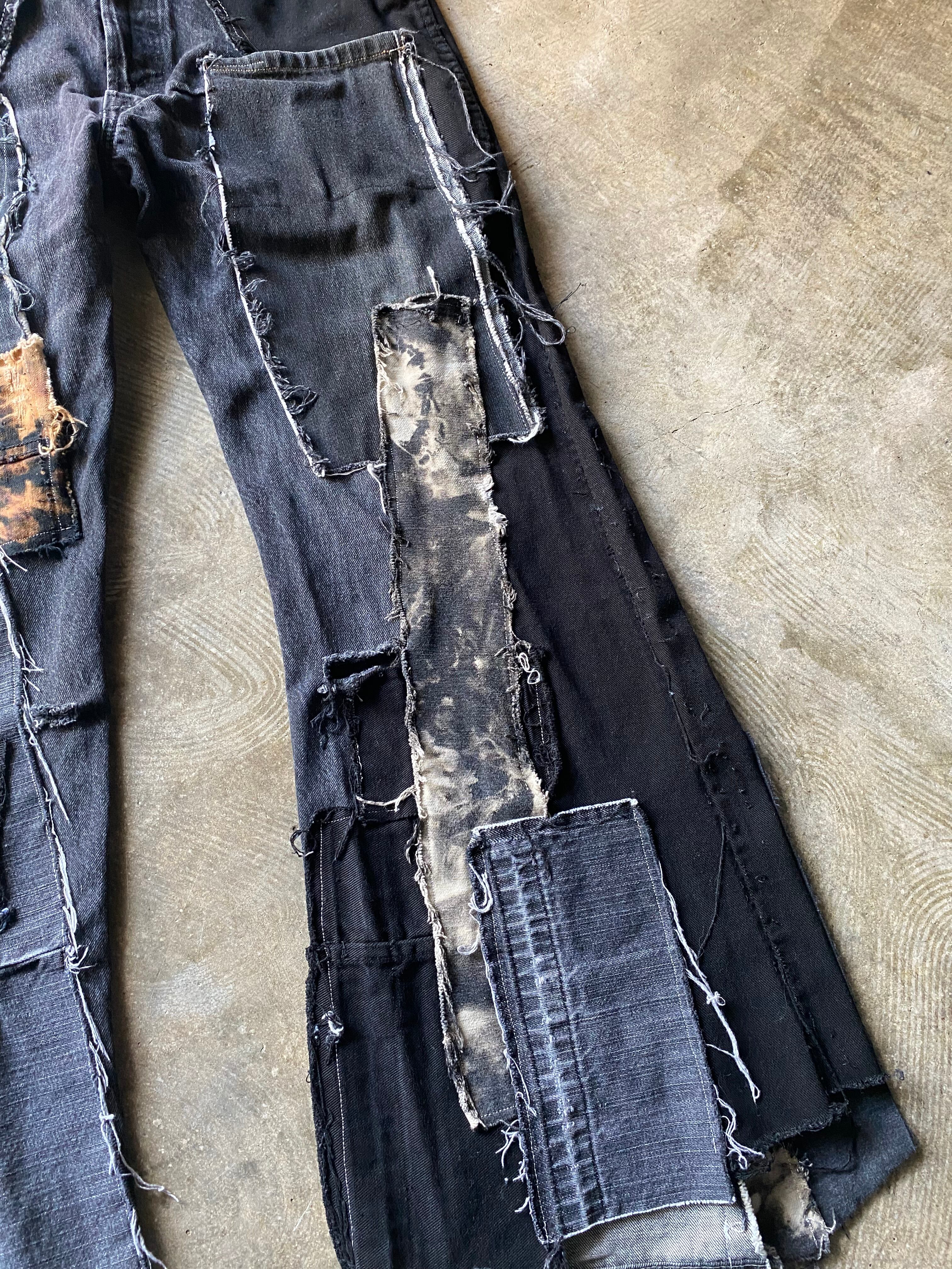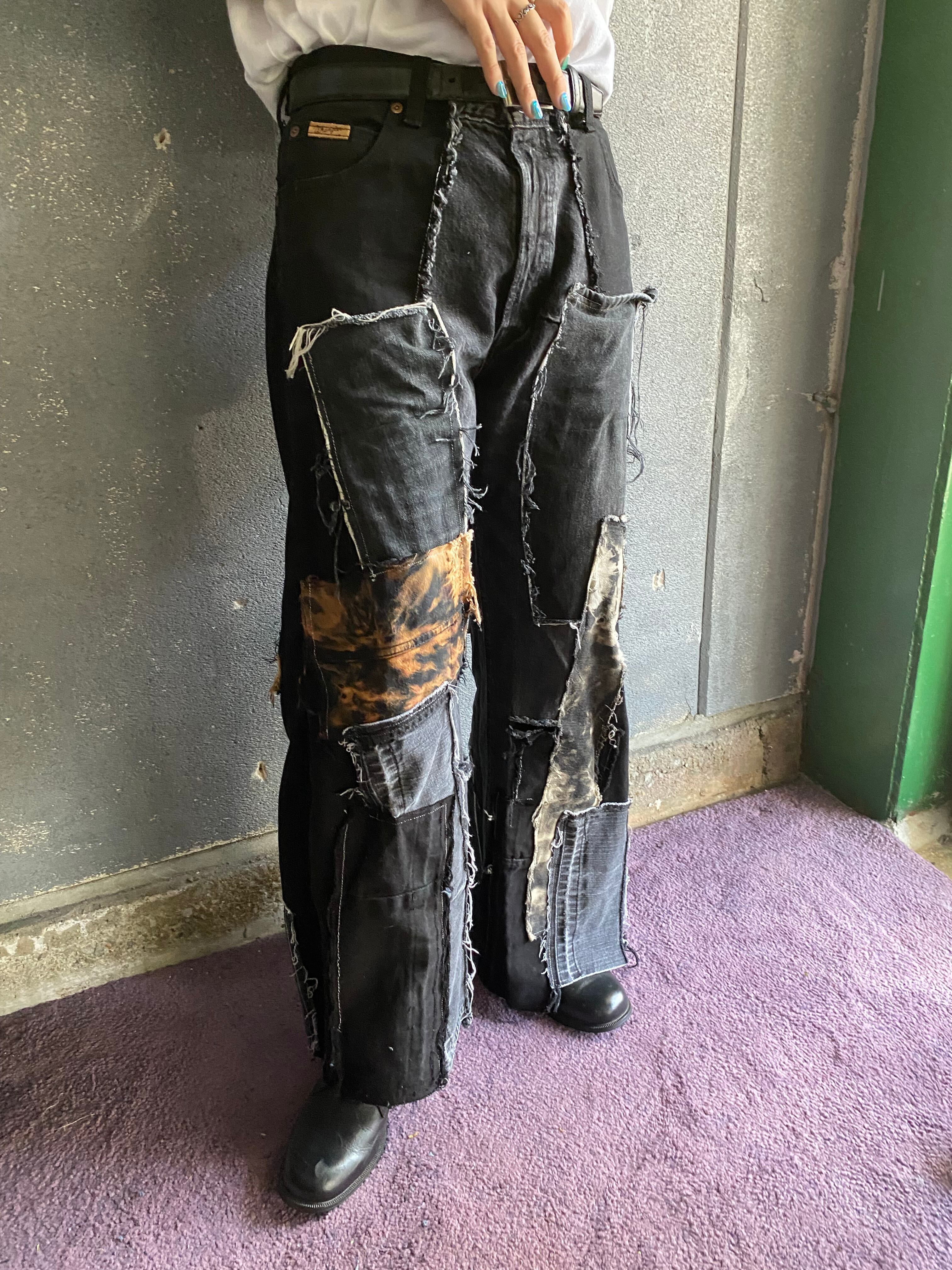 ドッキングされたリーバイスとラングラーのブラックデニムに大盤のパッチワークを仕掛けた一本。