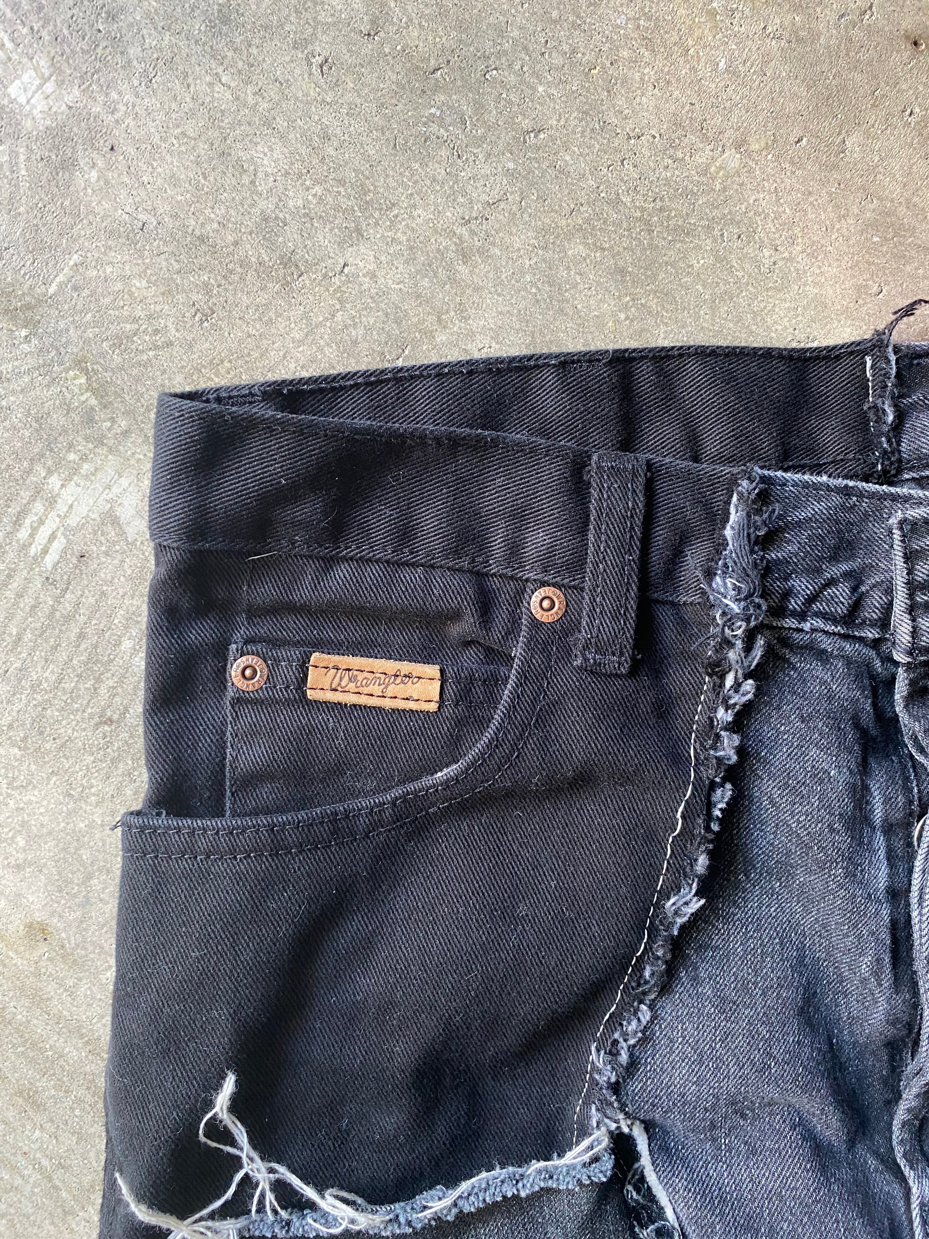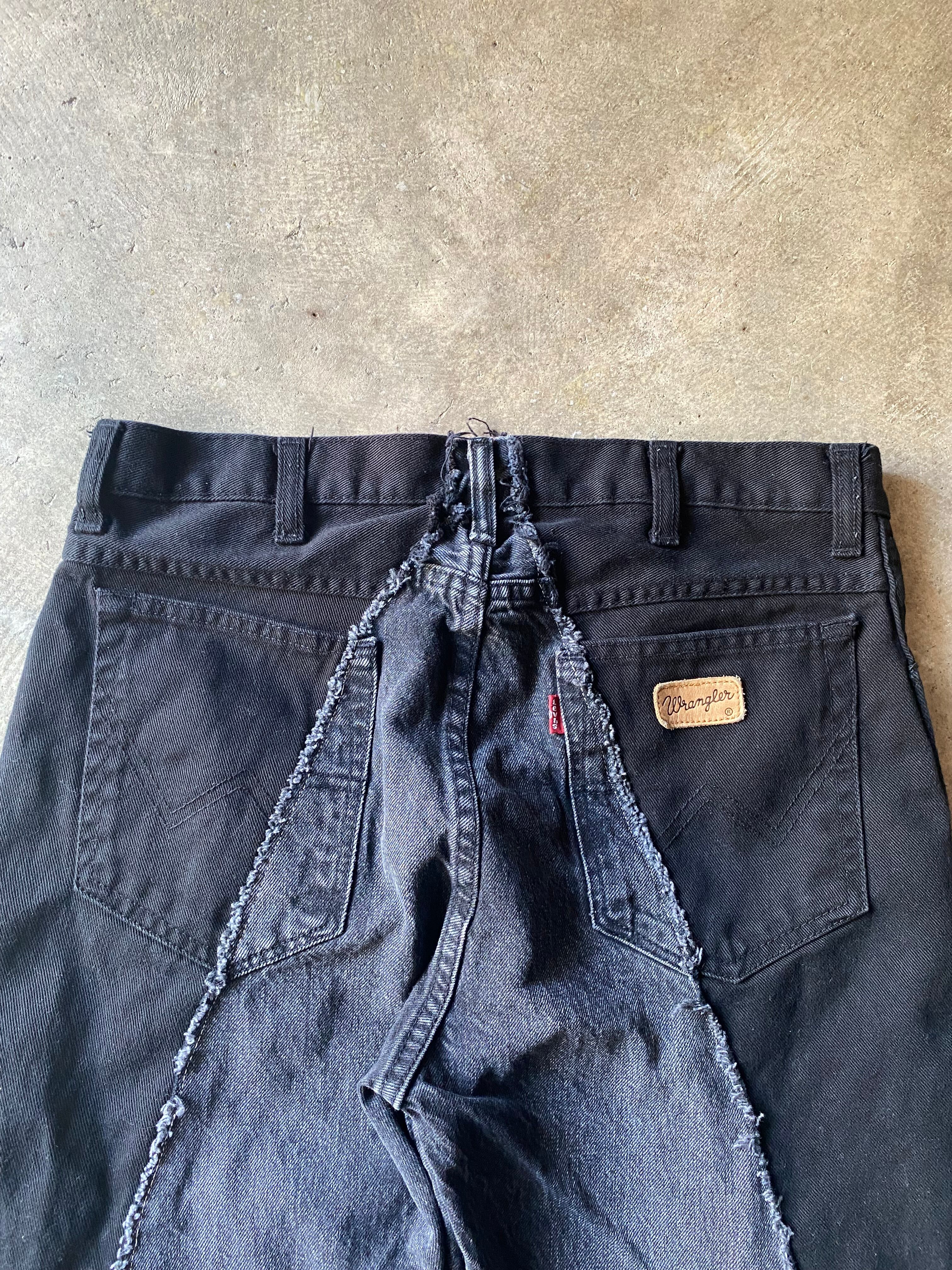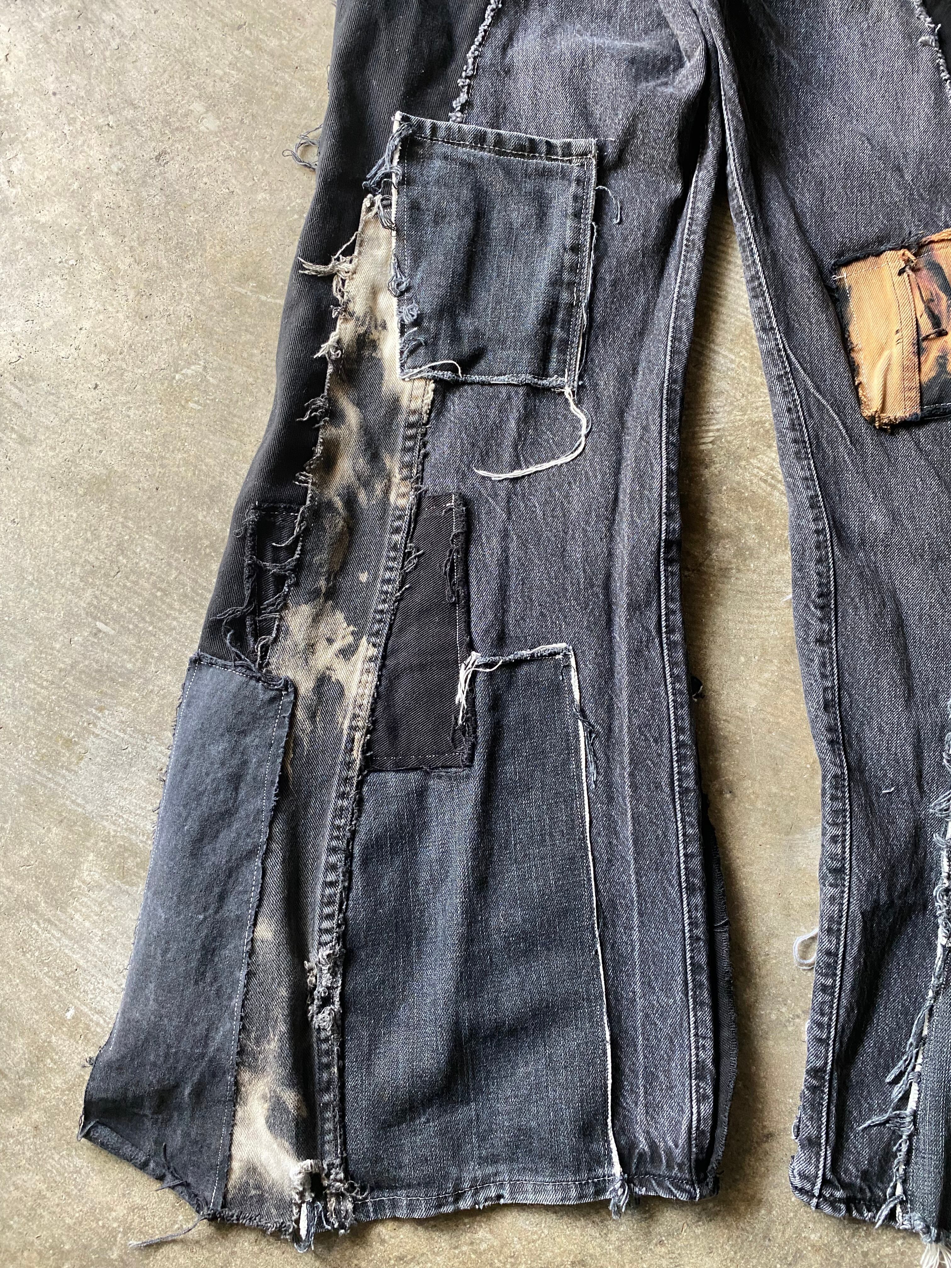 ドッキングされたリーバイスとラングラーのブラックデニムに大盤のパッチワークを仕掛けた一本。