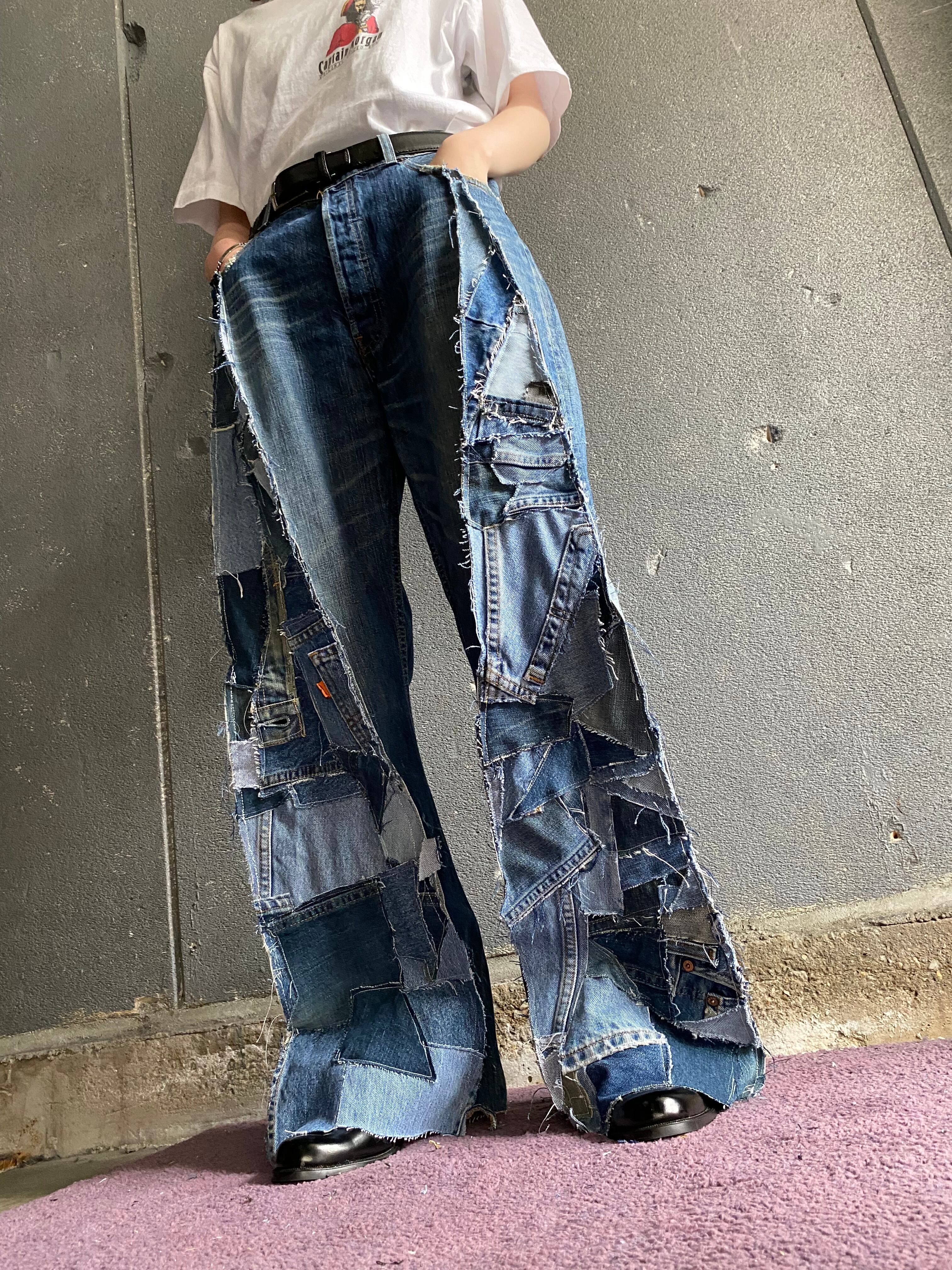 さまざまな生地を繋ぎ合わせた複雑なパッチワークを中央から大胆にドッキングしたリメイクデニム。