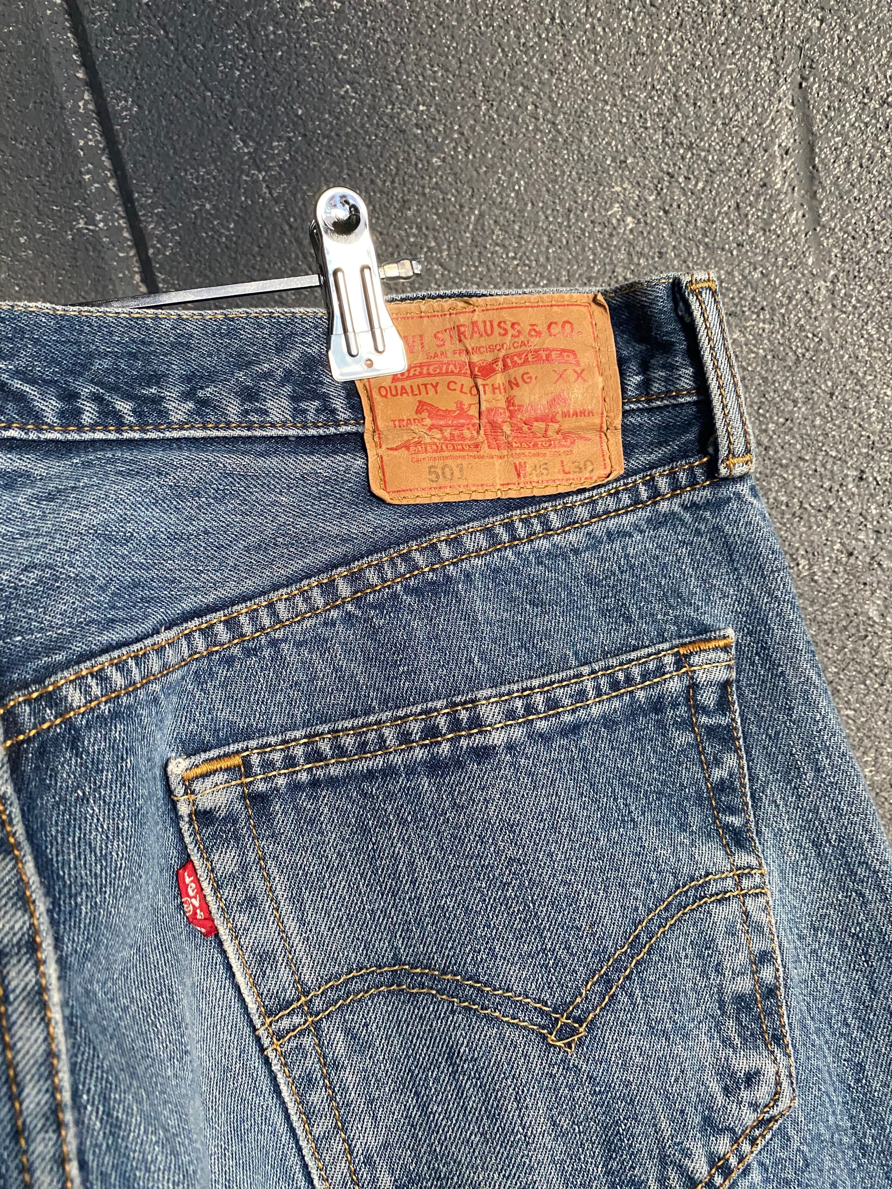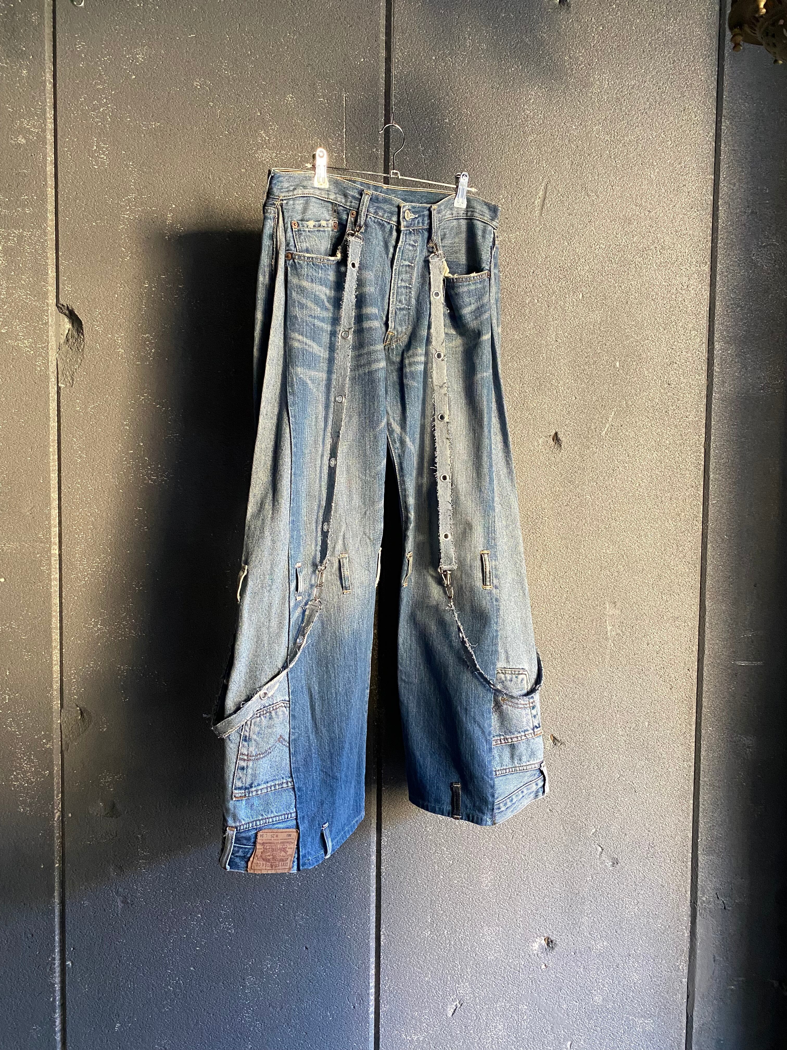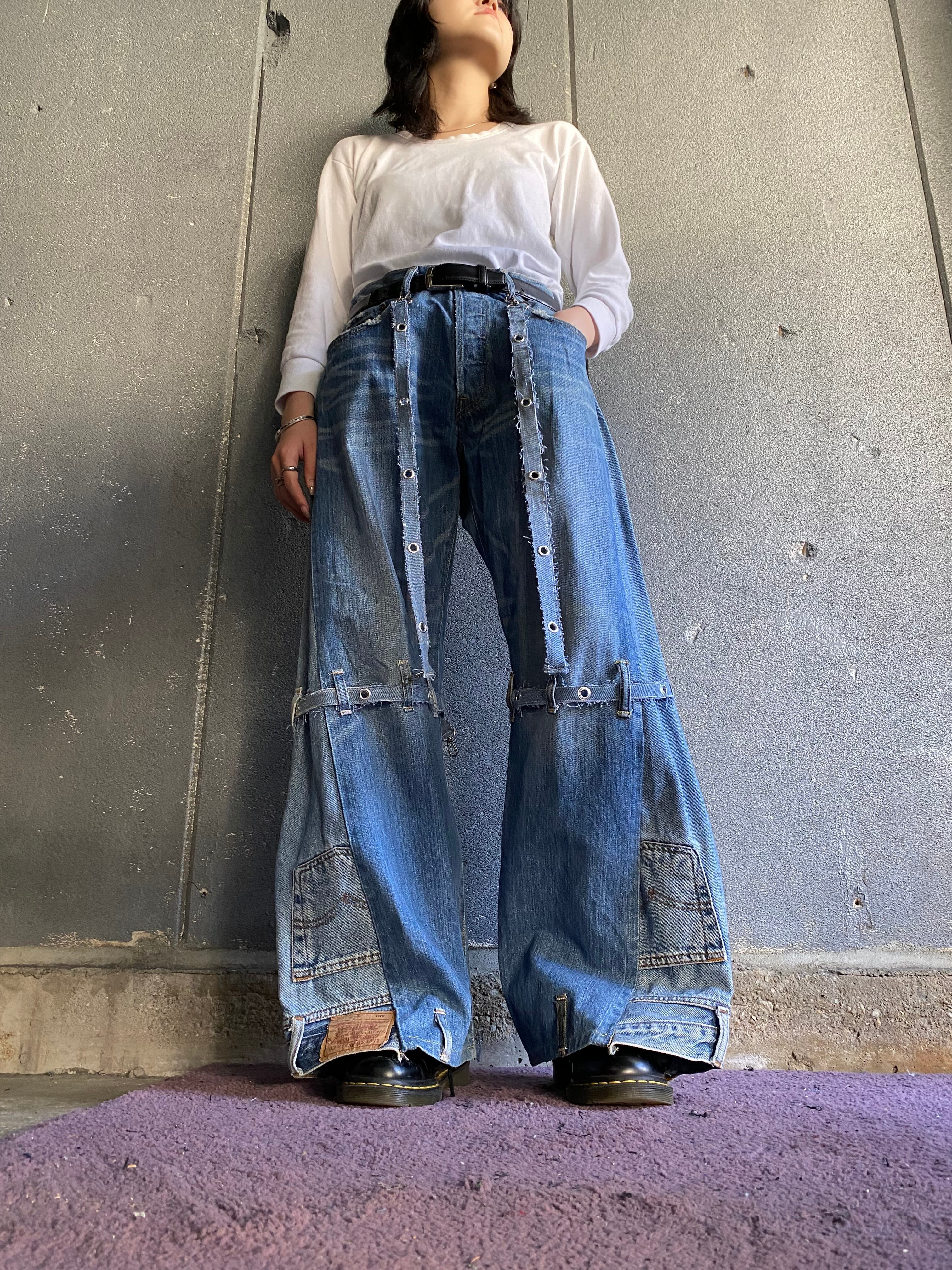 リーバイスデニムを2本使用し、逆さまにドッキングしたジーンズ。そこにギミックを追加して、アレンジの幅を持たせました。